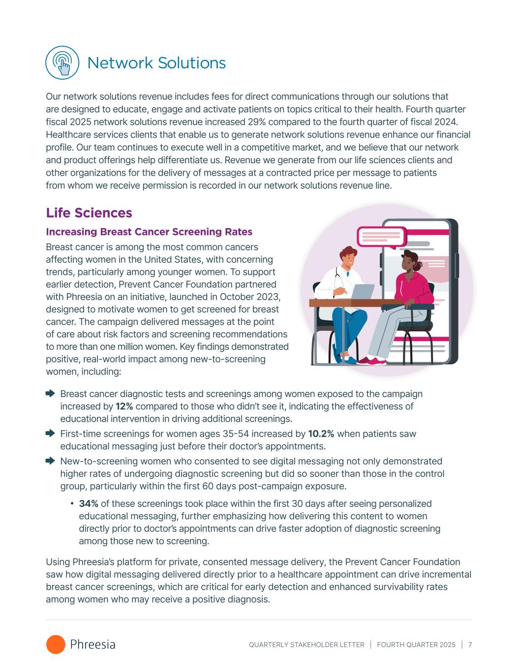 QUARTERLY STAKEHOLDER LETTER | FOURTH QUARTER 2025 | 7 Network Solutions Our network solutions revenue includes fees for direct communications through our solutions that are designed to educate, engage and activate patients on topics critical to their health. Fourth quarter fiscal 2025 network solutions revenue increased 29% compared to the fourth quarter of fiscal 2024. Healthcare services clients that enable us to generate network solutions revenue enhance our financial profile. Our team continues to execute well in a competitive market, and we believe that our network and product offerings help differentiate us. Revenue we generate from our life sciences clients and other organizations for the delivery of messages at a contracted price per message to patients from whom we receive permission is recorded in our network solutions revenue line. Life Sciences Increasing Breast Cancer Screening Rates Breast cancer is among the most common cancers affecting women in the United States, with concerning trends, particularly among younger women. To support earlier detection, Prevent Cancer Foundation partnered with Phreesia on an initiative, launched in October 2023, designed to motivate women to get screened for breast cancer. The campaign delivered messages at the point of care about risk factors and screening recommendations to more than one million women. Key findings demonstrated positive, real-world impact among new-to-screening women, including: Breast cancer diagnostic tests and screenings among women exposed to the campaign increased by 12% compared to those who didn’t see it, indicating the effectiveness of educational intervention in driving additional screenings. First-time screenings for women ages 35-54 increased by 10.2% when patients saw educational messaging just before their doctor’s appointments. New-to-screening women who consented to see digital messaging not only demonstrated higher rates of undergoing diagnostic screening but did so sooner than those in the control group, particularly within the first 60 days post-campaign exposure. 34% of these screenings took place within the first 30 days after seeing personalized educational messaging, further emphasizing how delivering this content to women directly prior to doctor’s appointments can drive faster adoption of diagnostic screening among those new to screening. Using Phreesia’s platform for private, consented message delivery, the Prevent Cancer Foundation saw how digital messaging delivered directly prior to a healthcare appointment can drive incremental breast cancer screenings, which are critical for early detection and enhanced survivability rates among women who may receive a positive diagnosis.