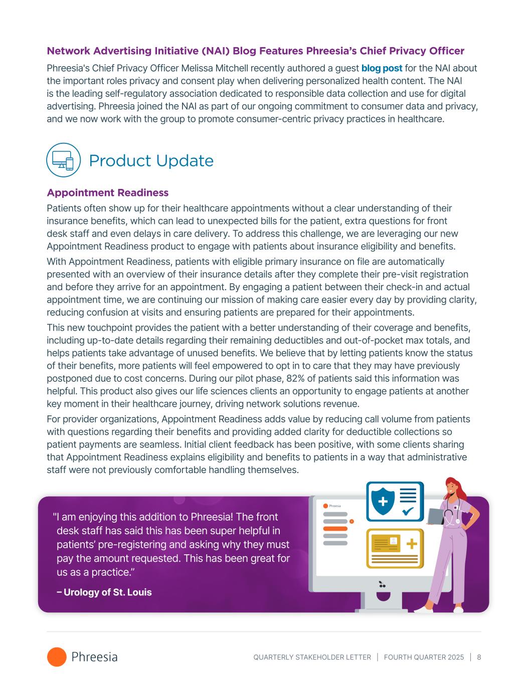QUARTERLY STAKEHOLDER LETTER | FOURTH QUARTER 2025 | 8 Network Advertising Initiative (NAI) Blog Features Phreesia’s Chief Privacy Officer Phreesia's Chief Privacy Officer Melissa Mitchell recently authored a guest blog post for the NAI about the important roles privacy and consent play when delivering personalized health content. The NAI is the leading self-regulatory association dedicated to responsible data collection and use for digital advertising. Phreesia joined the NAI as part of our ongoing commitment to consumer data and privacy, and we now work with the group to promote consumer-centric privacy practices in healthcare. Product Update Appointment Readiness Patients often show up for their healthcare appointments without a clear understanding of their insurance benefits, which can lead to unexpected bills for the patient, extra questions for front desk staff and even delays in care delivery. To address this challenge, we are leveraging our new Appointment Readiness product to engage with patients about insurance eligibility and benefits. With Appointment Readiness, patients with eligible primary insurance on file are automatically presented with an overview of their insurance details after they complete their pre-visit registration and before they arrive for an appointment. By engaging a patient between their check-in and actual appointment time, we are continuing our mission of making care easier every day by providing clarity, reducing confusion at visits and ensuring patients are prepared for their appointments. This new touchpoint provides the patient with a better understanding of their coverage and benefits, including up-to-date details regarding their remaining deductibles and out-of-pocket max totals, and helps patients take advantage of unused benefits. We believe that by letting patients know the status of their benefits, more patients will feel empowered to opt in to care that they may have previously postponed due to cost concerns. During our pilot phase, 82% of patients said this information was helpful. This product also gives our life sciences clients an opportunity to engage patients at another key moment in their healthcare journey, driving network solutions revenue. For provider organizations, Appointment Readiness adds value by reducing call volume from patients with questions regarding their benefits and providing added clarity for deductible collections so patient payments are seamless. Initial client feedback has been positive, with some clients sharing that Appointment Readiness explains eligibility and benefits to patients in a way that administrative staff were not previously comfortable handling themselves. " I am enjoying this addition to Phreesia! The front desk staff has said this has been super helpful in patients’ pre-registering and asking why they must pay the amount requested. This has been great for us as a practice.” – Urology of St. Louis