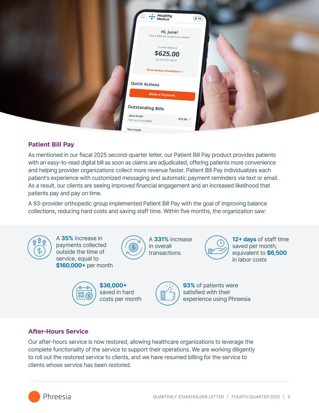 QUARTERLY STAKEHOLDER LETTER | FOURTH QUARTER 2025 | 9 Patient Bill Pay As mentioned in our fiscal 2025 second-quarter letter, our Patient Bill Pay product provides patients with an easy-to-read digital bill as soon as claims are adjudicated, offering patients more convenience and helping provider organizations collect more revenue faster. Patient Bill Pay individualizes each patient's experience with customized messaging and automatic payment reminders via text or email. As a result, our clients are seeing improved financial engagement and an increased likelihood that patients pay and pay on time. A 93-provider orthopedic group implemented Patient Bill Pay with the goal of improving balance collections, reducing hard costs and saving staff time. Within five months, the organization saw: After-Hours Service Our after-hours service is now restored, allowing healthcare organizations to leverage the complete functionality of the service to support their operations. We are working diligently to roll out the restored service to clients, and we have resumed billing for the service to clients whose service has been restored. A 35% increase in payments collected outside the time of service, equal to $160,000+ per month A 331% increase in overall transactions 12+ days of staff time saved per month, equivalent to $6,500 in labor costs $36,000+ saved in hard costs per month 93% of patients were satisfied with their experience using Phreesia