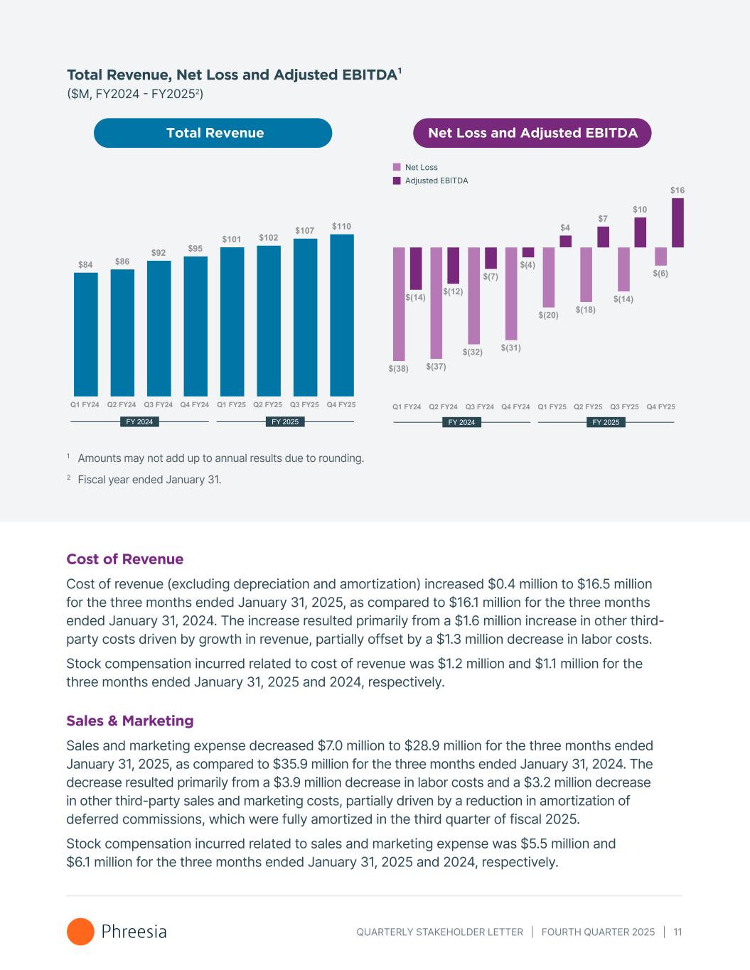 QUARTERLY STAKEHOLDER LETTER | FOURTH QUARTER 2025 | 11 Total Revenue, Net Loss and Adjusted EBITDA¹ ($M, FY2024 - FY20252) 1 Amounts may not add up to annual results due to rounding. 2 Fiscal year ended January 31. Net Loss and Adjusted EBITDATotal Revenue Adjusted EBITDA Net Loss Cost of Revenue Cost of revenue (excluding depreciation and amortization) increased $0.4 million to $16.5 million for the three months ended January 31, 2025, as compared to $16.1 million for the three months ended January 31, 2024. The increase resulted primarily from a $1.6 million increase in other third- party costs driven by growth in revenue, partially offset by a $1.3 million decrease in labor costs. Stock compensation incurred related to cost of revenue was $1.2 million and $1.1 million for the three months ended January 31, 2025 and 2024, respectively. Sales & Marketing Sales and marketing expense decreased $7.0 million to $28.9 million for the three months ended January 31, 2025, as compared to $35.9 million for the three months ended January 31, 2024. The decrease resulted primarily from a $3.9 million decrease in labor costs and a $3.2 million decrease in other third-party sales and marketing costs, partially driven by a reduction in amortization of deferred commissions, which were fully amortized in the third quarter of fiscal 2025. Stock compensation incurred related to sales and marketing expense was $5.5 million and $6.1 million for the three months ended January 31, 2025 and 2024, respectively.