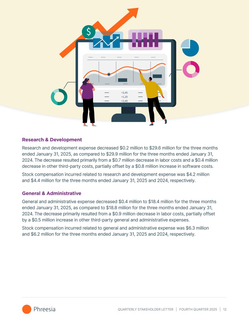 QUARTERLY STAKEHOLDER LETTER | FOURTH QUARTER 2025 | 12 Research & Development Research and development expense decreased $0.2 million to $29.6 million for the three months ended January 31, 2025, as compared to $29.9 million for the three months ended January 31, 2024. The decrease resulted primarily from a $0.7 million decrease in labor costs and a $0.4 million decrease in other third-party costs, partially offset by a $0.8 million increase in software costs. Stock compensation incurred related to research and development expense was $4.2 million and $4.4 million for the three months ended January 31, 2025 and 2024, respectively. General & Administrative General and administrative expense decreased $0.4 million to $18.4 million for the three months ended January 31, 2025, as compared to $18.8 million for the three months ended January 31, 2024. The decrease primarily resulted from a $0.9 million decrease in labor costs, partially offset by a $0.5 million increase in other third-party general and administrative expenses. Stock compensation incurred related to general and administrative expense was $6.3 million and $6.2 million for the three months ended January 31, 2025 and 2024, respectively.