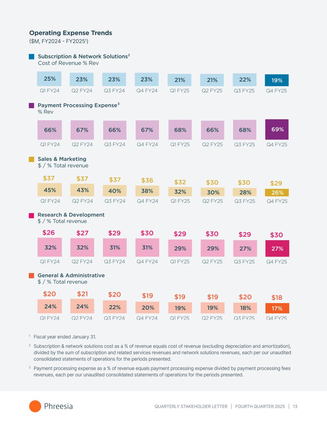 QUARTERLY STAKEHOLDER LETTER | FOURTH QUARTER 2025 | 13 12 Adjusted EBITDA is a non-GAAP measure. We define Adjusted EBITDA as net income or loss before interest income, net, provision for income taxes, depreciation and amortization, and before stock-based compensation expense, loss on extinguishment of debt and other expense (income), net. See “Non-GAAP Financial Measures” for a reconciliation of Adjusted EBITDA to the closest GAAP measure. Operating Expense Trends ($M, FY2024 - FY20251) 1 Fiscal year ended January 31. 2 Subscription & network solutions cost as a % of revenue equals cost of revenue (excluding depreciation and amortization), divided by the sum of subscription and related services revenues and network solutions revenues, each per our unaudited consolidated statements of operations for the periods presented. 3 Payment processing expense as a % of revenue equals payment processing expense divided by payment processing fees revenues, each per our unaudited consolidated statements of operations for the periods presented. Sales & Marketing $ / % Total revenue 45% $37 43% $37 40% $37 38% $36 32% $32 Research & Development $ / % Total revenue 32% $26 32% $27 31% $29 31% $30 29% $29 General & Administrative $ / % Total revenue 24% $20 24% $21 22% $20 20% $19 19% $19 Payment Processing Expense % Rev 66% 67% 66% 67% 68% Subscription & Network Solutions Cost of Revenue % Rev 25% Q1 FY24 Q2 FY24 Q3 FY24 Q4 FY24 23% Q1 FY25 23% Q2 FY25 23% 21% 21% 66% 30% $30 29% $30 19% $19 22% Q3 FY25 68% 28% $30 27% $29 18% $20 19% Q FY25 69% 26% $29 27% $30 17% $18 4 2 3 Q1 FY24 Q2 FY24 Q3 FY24 Q4 FY24 Q1 FY25 Q2 FY25 Q3 FY25 Q FY254 Q1 FY24 Q2 FY24 Q3 FY24 Q4 FY24 Q1 FY25 Q2 FY25 Q3 FY25 Q FY254 Q1 FY24 Q2 FY24 Q3 FY24 Q4 FY24 Q1 FY25 Q2 FY25 Q3 FY25 Q FY254 Q1 FY24 Q2 FY24 Q3 FY24 Q4 FY24 Q1 FY25 Q2 FY25 Q3 FY25 Q FY254