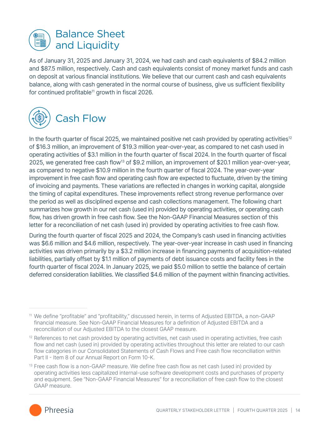 QUARTERLY STAKEHOLDER LETTER | FOURTH QUARTER 2025 | 14 Balance Sheet and Liquidity As of January 31, 2025 and January 31, 2024, we had cash and cash equivalents of $84.2 million and $87.5 million, respectively. Cash and cash equivalents consist of money market funds and cash on deposit at various financial institutions. We believe that our current cash and cash equivalents balance, along with cash generated in the normal course of business, give us sufficient flexibility for continued profitable11 growth in fiscal 2026. Cash Flow In the fourth quarter of fiscal 2025, we maintained positive net cash provided by operating activities12 of $16.3 million, an improvement of $19.3 million year-over-year, as compared to net cash used in operating activities of $3.1 million in the fourth quarter of fiscal 2024. In the fourth quarter of fiscal 2025, we generated free cash flow13 of $9.2 million, an improvement of $20.1 million year-over-year, as compared to negative $10.9 million in the fourth quarter of fiscal 2024. The year-over-year improvement in free cash flow and operating cash flow are expected to fluctuate, driven by the timing of invoicing and payments. These variations are reflected in changes in working capital, alongside the timing of capital expenditures. These improvements reflect strong revenue performance over the period as well as disciplined expense and cash collections management. The following chart summarizes how growth in our net cash (used in) provided by operating activities, or operating cash flow, has driven growth in free cash flow. See the Non-GAAP Financial Measures section of this letter for a reconciliation of net cash (used in) provided by operating activities to free cash flow. During the fourth quarter of fiscal 2025 and 2024, the Company’s cash used in financing activities was $6.6 million and $4.6 million, respectively. The year-over-year increase in cash used in financing activities was driven primarily by a $3.2 million increase in financing payments of acquisition-related liabilities, partially offset by $1.1 million of payments of debt issuance costs and facility fees in the fourth quarter of fiscal 2024. In January 2025, we paid $5.0 million to settle the balance of certain deferred consideration liabilities. We classified $4.6 million of the payment within financing activities. 11 We define “profitable” and “profitability,” discussed herein, in terms of Adjusted EBITDA, a non-GAAP financial measure. See Non-GAAP Financial Measures for a definition of Adjusted EBITDA and a reconciliation of our Adjusted EBITDA to the closest GAAP measure. 12 References to net cash provided by operating activities, net cash used in operating activities, free cash flow and net cash (used in) provided by operating activities throughout this letter are related to our cash flow categories in our Consolidated Statements of Cash Flows and Free cash flow reconciliation within Part II - Item 8 of our Annual Report on Form 10-K. 13 Free cash flow is a non-GAAP measure. We define free cash flow as net cash (used in) provided by operating activities less capitalized internal-use software development costs and purchases of property and equipment. See “Non-GAAP Financial Measures” for a reconciliation of free cash flow to the closest GAAP measure.
