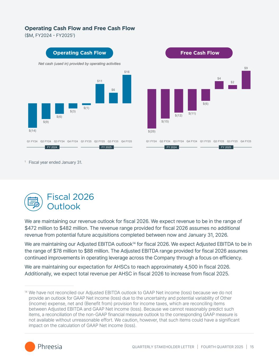 QUARTERLY STAKEHOLDER LETTER | FOURTH QUARTER 2025 | 15 Operating Cash Flow and Free Cash Flow ($M, FY2024 - FY20251) 1 Fiscal year ended January 31. Fiscal 2026 Outlook We are maintaining our revenue outlook for fiscal 2026. We expect revenue to be in the range of $472 million to $482 million. The revenue range provided for fiscal 2026 assumes no additional revenue from potential future acquisitions completed between now and January 31, 2026. We are maintaining our Adjusted EBITDA outlook14 for fiscal 2026. We expect Adjusted EBITDA to be in the range of $78 million to $88 million. The Adjusted EBITDA range provided for fiscal 2026 assumes continued improvements in operating leverage across the Company through a focus on efficiency. We are maintaining our expectation for AHSCs to reach approximately 4,500 in fiscal 2026. Additionally, we expect total revenue per AHSC in fiscal 2026 to increase from fiscal 2025. Operating Cash Flow Free Cash Flow 14 We have not reconciled our Adjusted EBITDA outlook to GAAP Net income (loss) because we do not provide an outlook for GAAP Net income (loss) due to the uncertainty and potential variability of Other (income) expense, net and (Benefit from) provision for income taxes, which are reconciling items between Adjusted EBITDA and GAAP Net income (loss). Because we cannot reasonably predict such items, a reconciliation of the non-GAAP financial measure outlook to the corresponding GAAP measure is not available without unreasonable effort. We caution, however, that such items could have a significant impact on the calculation of GAAP Net income (loss).