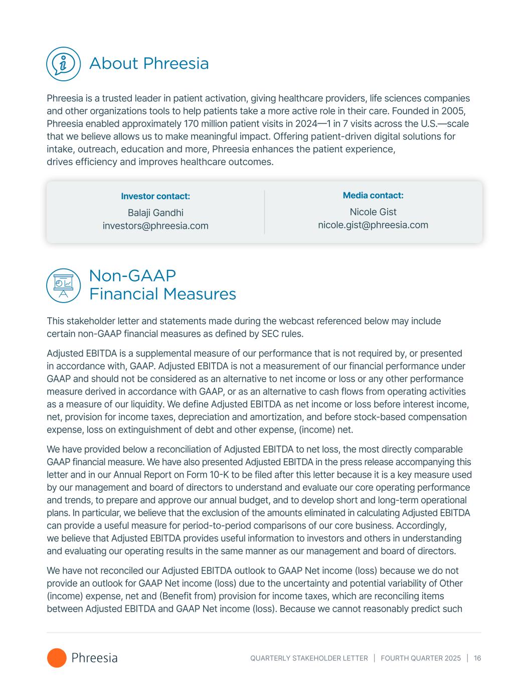 QUARTERLY STAKEHOLDER LETTER | FOURTH QUARTER 2025 | 16 About Phreesia Phreesia is a trusted leader in patient activation, giving healthcare providers, life sciences companies and other organizations tools to help patients take a more active role in their care. Founded in 2005, Phreesia enabled approximately 170 million patient visits in 2024—1 in 7 visits across the U.S.—scale that we believe allows us to make meaningful impact. Offering patient-driven digital solutions for intake, outreach, education and more, Phreesia enhances the patient experience, drives efficiency and improves healthcare outcomes. Media contact: Nicole Gist nicole.gist@phreesia.com Investor contact: Balaji Gandhi investors@phreesia.com Non-GAAP Financial Measures This stakeholder letter and statements made during the webcast referenced below may include certain non-GAAP financial measures as defined by SEC rules. Adjusted EBITDA is a supplemental measure of our performance that is not required by, or presented in accordance with, GAAP. Adjusted EBITDA is not a measurement of our financial performance under GAAP and should not be considered as an alternative to net income or loss or any other performance measure derived in accordance with GAAP, or as an alternative to cash flows from operating activities as a measure of our liquidity. We define Adjusted EBITDA as net income or loss before interest income, net, provision for income taxes, depreciation and amortization, and before stock-based compensation expense, loss on extinguishment of debt and other expense, (income) net. We have provided below a reconciliation of Adjusted EBITDA to net loss, the most directly comparable GAAP financial measure. We have also presented Adjusted EBITDA in the press release accompanying this letter and in our Annual Report on Form 10-K to be filed after this letter because it is a key measure used by our management and board of directors to understand and evaluate our core operating performance and trends, to prepare and approve our annual budget, and to develop short and long-term operational plans. In particular, we believe that the exclusion of the amounts eliminated in calculating Adjusted EBITDA can provide a useful measure for period-to-period comparisons of our core business. Accordingly, we believe that Adjusted EBITDA provides useful information to investors and others in understanding and evaluating our operating results in the same manner as our management and board of directors. We have not reconciled our Adjusted EBITDA outlook to GAAP Net income (loss) because we do not provide an outlook for GAAP Net income (loss) due to the uncertainty and potential variability of Other (income) expense, net and (Benefit from) provision for income taxes, which are reconciling items between Adjusted EBITDA and GAAP Net income (loss). Because we cannot reasonably predict such
