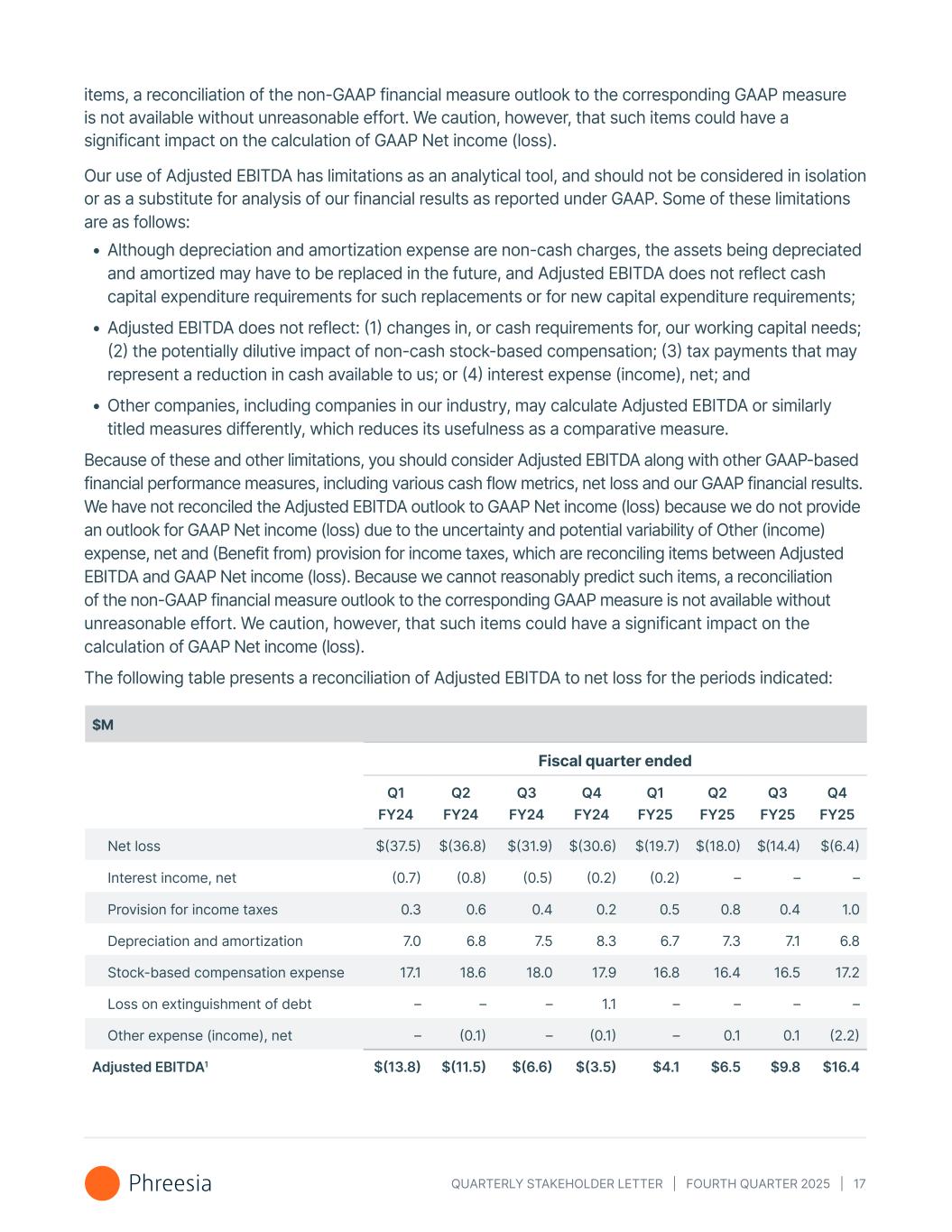 QUARTERLY STAKEHOLDER LETTER | FOURTH QUARTER 2025 | 17 items, a reconciliation of the non-GAAP financial measure outlook to the corresponding GAAP measure is not available without unreasonable effort. We caution, however, that such items could have a significant impact on the calculation of GAAP Net income (loss). Our use of Adjusted EBITDA has limitations as an analytical tool, and should not be considered in isolation or as a substitute for analysis of our financial results as reported under GAAP. Some of these limitations are as follows: • Although depreciation and amortization expense are non-cash charges, the assets being depreciated and amortized may have to be replaced in the future, and Adjusted EBITDA does not reflect cash capital expenditure requirements for such replacements or for new capital expenditure requirements; • Adjusted EBITDA does not reflect: (1) changes in, or cash requirements for, our working capital needs; (2) the potentially dilutive impact of non-cash stock-based compensation; (3) tax payments that may represent a reduction in cash available to us; or (4) interest expense (income), net; and • Other companies, including companies in our industry, may calculate Adjusted EBITDA or similarly titled measures differently, which reduces its usefulness as a comparative measure. Because of these and other limitations, you should consider Adjusted EBITDA along with other GAAP-based financial performance measures, including various cash flow metrics, net loss and our GAAP financial results. We have not reconciled the Adjusted EBITDA outlook to GAAP Net income (loss) because we do not provide an outlook for GAAP Net income (loss) due to the uncertainty and potential variability of Other (income) expense, net and (Benefit from) provision for income taxes, which are reconciling items between Adjusted EBITDA and GAAP Net income (loss). Because we cannot reasonably predict such items, a reconciliation of the non-GAAP financial measure outlook to the corresponding GAAP measure is not available without unreasonable effort. We caution, however, that such items could have a significant impact on the calculation of GAAP Net income (loss). The following table presents a reconciliation of Adjusted EBITDA to net loss for the periods indicated: $M Fiscal quarter ended Q1 FY24 Q2 FY24 Q3 FY24 Q4 FY24 Q1 FY25 Q2 FY25 Q3 FY25 Q4 FY25 Net loss $(37.5) $(36.8) $(31.9) $(30.6) $(19.7) $(18.0) $(14.4) $(6.4) Interest income, net (0.7) (0.8) (0.5) (0.2) (0.2) – – – Provision for income taxes 0.3 0.6 0.4 0.2 0.5 0.8 0.4 1.0 Depreciation and amortization 7.0 6.8 7.5 8.3 6.7 7.3 7.1 6.8 Stock-based compensation expense 17.1 18.6 18.0 17.9 16.8 16.4 16.5 17.2 Loss on extinguishment of debt – – – 1.1 – – – – Other expense (income), net – (0.1) – (0.1) – 0.1 0.1 (2.2) Adjusted EBITDA1 $(13.8) $(11.5) $(6.6) $(3.5) $4.1 $6.5 $9.8 $16.4