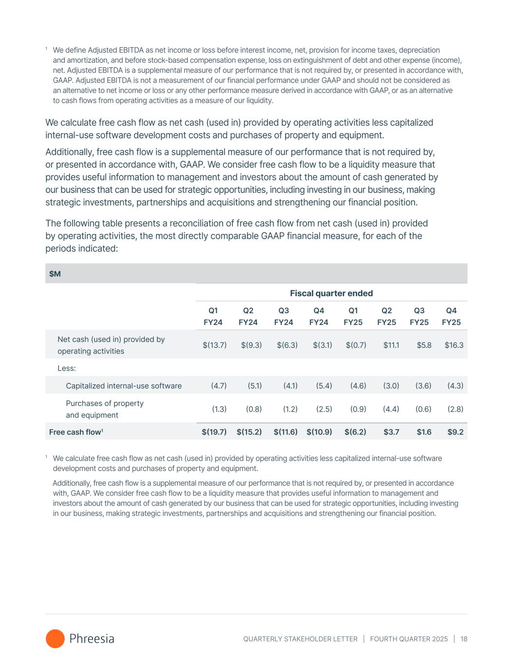 QUARTERLY STAKEHOLDER LETTER | FOURTH QUARTER 2025 | 18 We calculate free cash flow as net cash (used in) provided by operating activities less capitalized internal-use software development costs and purchases of property and equipment. Additionally, free cash flow is a supplemental measure of our performance that is not required by, or presented in accordance with, GAAP. We consider free cash flow to be a liquidity measure that provides useful information to management and investors about the amount of cash generated by our business that can be used for strategic opportunities, including investing in our business, making strategic investments, partnerships and acquisitions and strengthening our financial position. The following table presents a reconciliation of free cash flow from net cash (used in) provided by operating activities, the most directly comparable GAAP financial measure, for each of the periods indicated: $M Fiscal quarter ended Q1 FY24 Q2 FY24 Q3 FY24 Q4 FY24 Q1 FY25 Q2 FY25 Q3 FY25 Q4 FY25 Net cash (used in) provided by operating activities $(13.7) $(9.3) $(6.3) $(3.1) $(0.7) $11.1 $5.8 $16.3 Less: Capitalized internal-use software (4.7) (5.1) (4.1) (5.4) (4.6) (3.0) (3.6) (4.3) Purchases of property and equipment (1.3) (0.8) (1.2) (2.5) (0.9) (4.4) (0.6) (2.8) Free cash flow1 $(19.7) $(15.2) $(11.6) $(10.9) $(6.2) $3.7 $1.6 $9.2 1 We define Adjusted EBITDA as net income or loss before interest income, net, provision for income taxes, depreciation and amortization, and before stock-based compensation expense, loss on extinguishment of debt and other expense (income), net. Adjusted EBITDA is a supplemental measure of our performance that is not required by, or presented in accordance with, GAAP. Adjusted EBITDA is not a measurement of our financial performance under GAAP and should not be considered as an alternative to net income or loss or any other performance measure derived in accordance with GAAP, or as an alternative to cash flows from operating activities as a measure of our liquidity. 1 We calculate free cash flow as net cash (used in) provided by operating activities less capitalized internal-use software development costs and purchases of property and equipment. Additionally, free cash flow is a supplemental measure of our performance that is not required by, or presented in accordance with, GAAP. We consider free cash flow to be a liquidity measure that provides useful information to management and investors about the amount of cash generated by our business that can be used for strategic opportunities, including investing in our business, making strategic investments, partnerships and acquisitions and strengthening our financial position.