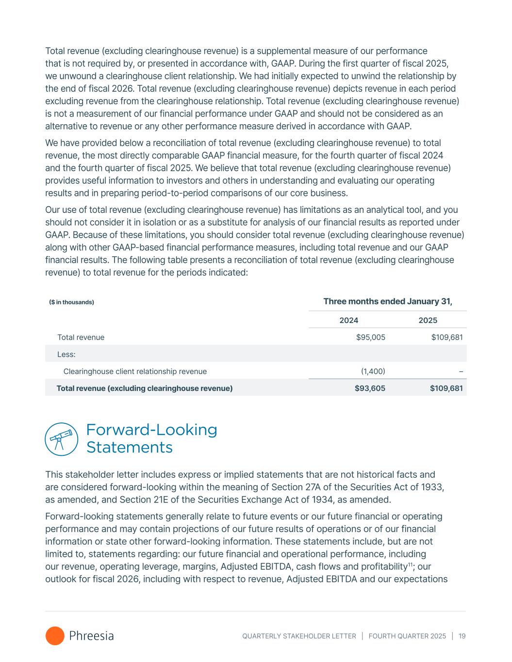 QUARTERLY STAKEHOLDER LETTER | FOURTH QUARTER 2025 | 19 Total revenue (excluding clearinghouse revenue) is a supplemental measure of our performance that is not required by, or presented in accordance with, GAAP. During the first quarter of fiscal 2025, we unwound a clearinghouse client relationship. We had initially expected to unwind the relationship by the end of fiscal 2026. Total revenue (excluding clearinghouse revenue) depicts revenue in each period excluding revenue from the clearinghouse relationship. Total revenue (excluding clearinghouse revenue) is not a measurement of our financial performance under GAAP and should not be considered as an alternative to revenue or any other performance measure derived in accordance with GAAP. We have provided below a reconciliation of total revenue (excluding clearinghouse revenue) to total revenue, the most directly comparable GAAP financial measure, for the fourth quarter of fiscal 2024 and the fourth quarter of fiscal 2025. We believe that total revenue (excluding clearinghouse revenue) provides useful information to investors and others in understanding and evaluating our operating results and in preparing period-to-period comparisons of our core business. Our use of total revenue (excluding clearinghouse revenue) has limitations as an analytical tool, and you should not consider it in isolation or as a substitute for analysis of our financial results as reported under GAAP. Because of these limitations, you should consider total revenue (excluding clearinghouse revenue) along with other GAAP-based financial performance measures, including total revenue and our GAAP financial results. The following table presents a reconciliation of total revenue (excluding clearinghouse revenue) to total revenue for the periods indicated: ($ in thousands) Three months ended January 31, 2024 2025 Total revenue $95,005 $109,681 Less: Clearinghouse client relationship revenue (1,400) – Total revenue (excluding clearinghouse revenue) $93,605 $109,681 Forward-Looking Statements This stakeholder letter includes express or implied statements that are not historical facts and are considered forward-looking within the meaning of Section 27A of the Securities Act of 1933, as amended, and Section 21E of the Securities Exchange Act of 1934, as amended. Forward-looking statements generally relate to future events or our future financial or operating performance and may contain projections of our future results of operations or of our financial information or state other forward-looking information. These statements include, but are not limited to, statements regarding: our future financial and operational performance, including our revenue, operating leverage, margins, Adjusted EBITDA, cash flows and profitability11; our outlook for fiscal 2026, including with respect to revenue, Adjusted EBITDA and our expectations