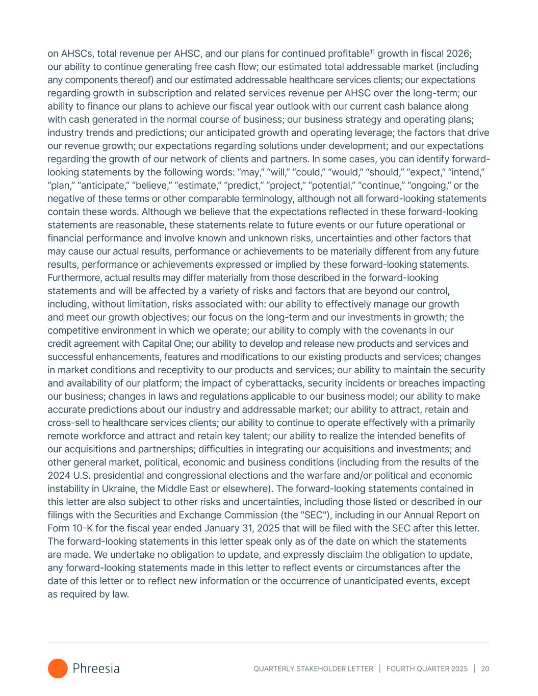 QUARTERLY STAKEHOLDER LETTER | FOURTH QUARTER 2025 | 20 on AHSCs, total revenue per AHSC, and our plans for continued profitable11 growth in fiscal 2026; our ability to continue generating free cash flow; our estimated total addressable market (including any components thereof) and our estimated addressable healthcare services clients; our expectations regarding growth in subscription and related services revenue per AHSC over the long-term; our ability to finance our plans to achieve our fiscal year outlook with our current cash balance along with cash generated in the normal course of business; our business strategy and operating plans; industry trends and predictions; our anticipated growth and operating leverage; the factors that drive our revenue growth; our expectations regarding solutions under development; and our expectations regarding the growth of our network of clients and partners. In some cases, you can identify forward- looking statements by the following words: “may,” “will,” “could,” “would,” “should,” “expect,” “intend,” “plan,” “anticipate,” “believe,” “estimate,” “predict,” “project,” “potential,” “continue,” “ongoing,” or the negative of these terms or other comparable terminology, although not all forward-looking statements contain these words. Although we believe that the expectations reflected in these forward-looking statements are reasonable, these statements relate to future events or our future operational or financial performance and involve known and unknown risks, uncertainties and other factors that may cause our actual results, performance or achievements to be materially different from any future results, performance or achievements expressed or implied by these forward-looking statements. Furthermore, actual results may differ materially from those described in the forward-looking statements and will be affected by a variety of risks and factors that are beyond our control, including, without limitation, risks associated with: our ability to effectively manage our growth and meet our growth objectives; our focus on the long-term and our investments in growth; the competitive environment in which we operate; our ability to comply with the covenants in our credit agreement with Capital One; our ability to develop and release new products and services and successful enhancements, features and modifications to our existing products and services; changes in market conditions and receptivity to our products and services; our ability to maintain the security and availability of our platform; the impact of cyberattacks, security incidents or breaches impacting our business; changes in laws and regulations applicable to our business model; our ability to make accurate predictions about our industry and addressable market; our ability to attract, retain and cross-sell to healthcare services clients; our ability to continue to operate effectively with a primarily remote workforce and attract and retain key talent; our ability to realize the intended benefits of our acquisitions and partnerships; difficulties in integrating our acquisitions and investments; and other general market, political, economic and business conditions (including from the results of the 2024 U.S. presidential and congressional elections and the warfare and/or political and economic instability in Ukraine, the Middle East or elsewhere). The forward-looking statements contained in this letter are also subject to other risks and uncertainties, including those listed or described in our filings with the Securities and Exchange Commission (the "SEC"), including in our Annual Report on Form 10-K for the fiscal year ended January 31, 2025 that will be filed with the SEC after this letter. The forward-looking statements in this letter speak only as of the date on which the statements are made. We undertake no obligation to update, and expressly disclaim the obligation to update, any forward-looking statements made in this letter to reflect events or circumstances after the date of this letter or to reflect new information or the occurrence of unanticipated events, except as required by law.