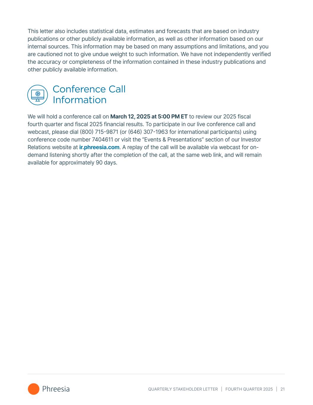 QUARTERLY STAKEHOLDER LETTER | FOURTH QUARTER 2025 | 21 This letter also includes statistical data, estimates and forecasts that are based on industry publications or other publicly available information, as well as other information based on our internal sources. This information may be based on many assumptions and limitations, and you are cautioned not to give undue weight to such information. We have not independently verified the accuracy or completeness of the information contained in these industry publications and other publicly available information. Conference Call Information We will hold a conference call on March 12, 2025 at 5:00 PM ET to review our 2025 fiscal fourth quarter and fiscal 2025 financial results. To participate in our live conference call and webcast, please dial (800) 715-9871 (or (646) 307-1963 for international participants) using conference code number 7404611 or visit the “Events & Presentations” section of our Investor Relations website at ir.phreesia.com. A replay of the call will be available via webcast for on- demand listening shortly after the completion of the call, at the same web link, and will remain available for approximately 90 days.