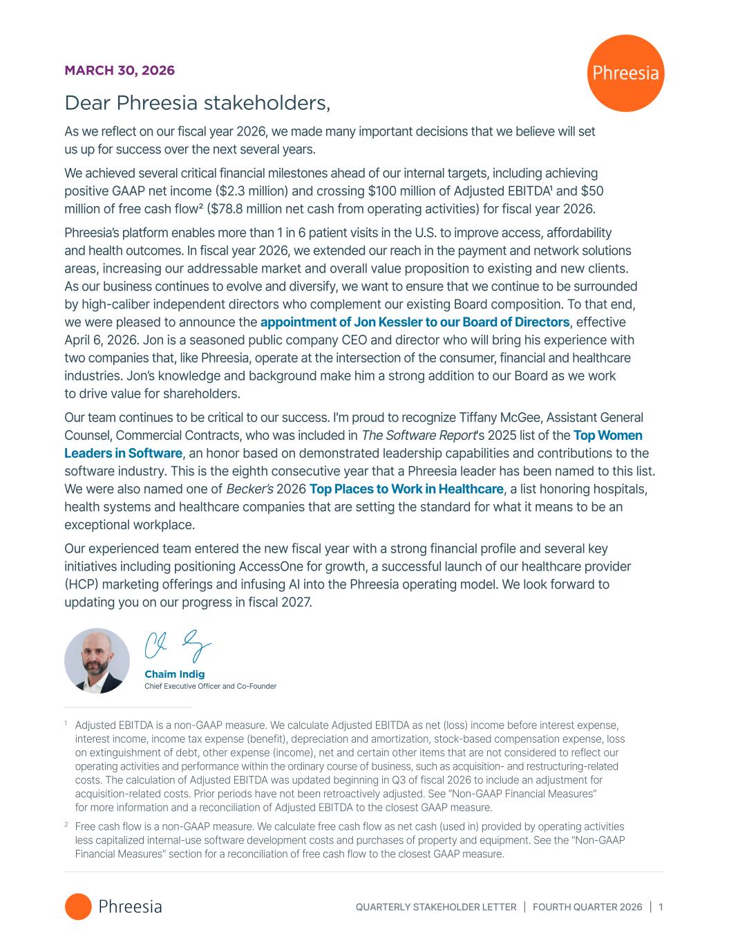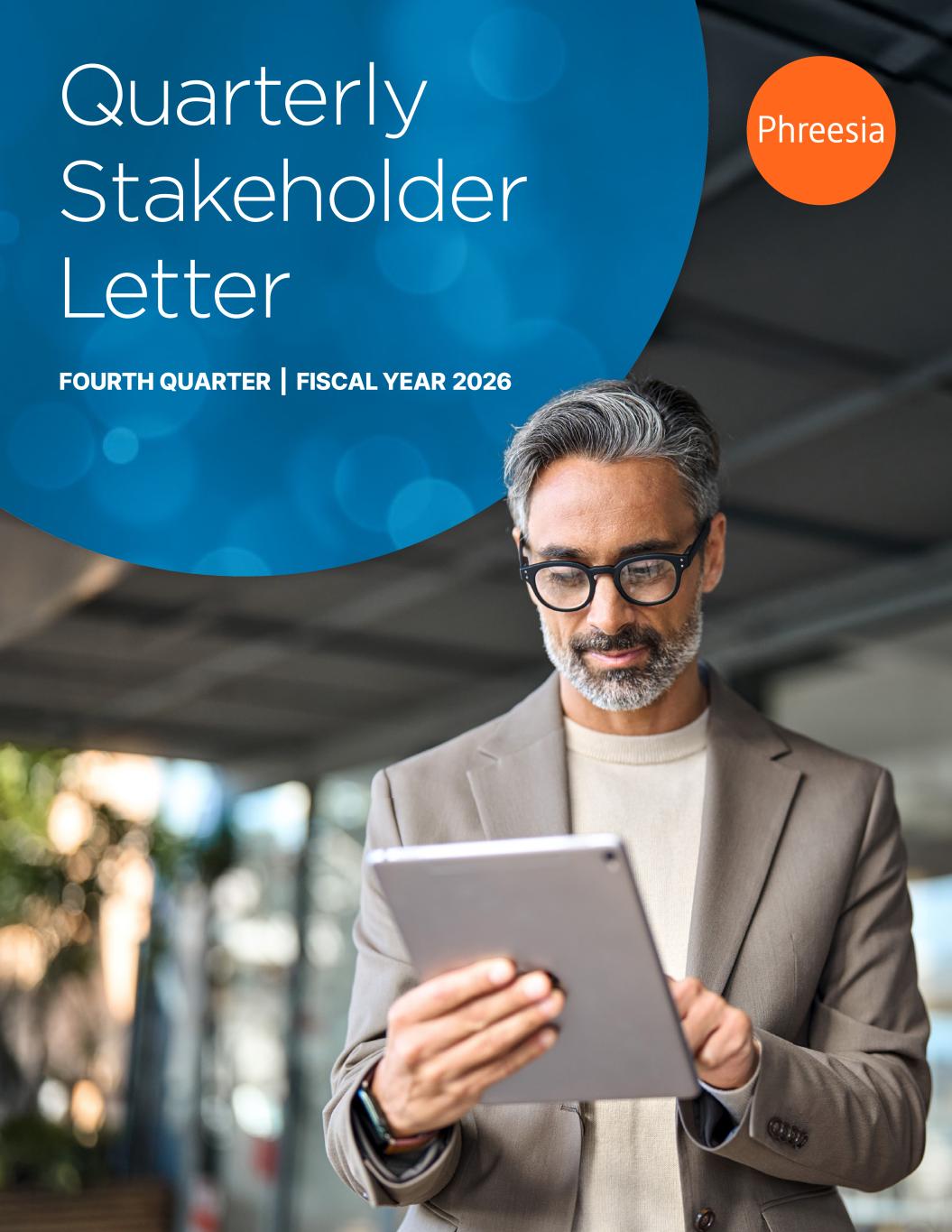 QUARTERLY STAKEHOLDER LETTER | FOURTH QUARTER 2026 | 1 Dear Phreesia stakeholders, As we reflect on our fiscal year 2026, we made many important decisions that we believe will set us up for success over the next several years. We achieved several critical financial milestones ahead of our internal targets, including achieving positive GAAP net income ($2.3 million) and crossing $100 million of Adjusted EBITDA1 and $50 million of free cash flow2 ($78.8 million net cash from operating activities) for fiscal year 2026. Phreesia’s platform enables more than 1 in 6 patient visits in the U.S. to improve access, affordability and health outcomes. In fiscal year 2026, we extended our reach in the payment and network solutions areas, increasing our addressable market and overall value proposition to existing and new clients. As our business continues to evolve and diversify, we want to ensure that we continue to be surrounded by high-caliber independent directors who complement our existing Board composition. To that end, we were pleased to announce the appointment of Jon Kessler to our Board of Directors, effective April 6, 2026. Jon is a seasoned public company CEO and director who will bring his experience with two companies that, like Phreesia, operate at the intersection of the consumer, financial and healthcare industries. Jon’s knowledge and background make him a strong addition to our Board as we work to drive value for shareholders. Our team continues to be critical to our success. I'm proud to recognize Tiffany McGee, Assistant General Counsel, Commercial Contracts, who was included in The Software Report's 2025 list of the Top Women Leaders in Software, an honor based on demonstrated leadership capabilities and contributions to the software industry. This is the eighth consecutive year that a Phreesia leader has been named to this list. We were also named one of Becker’s 2026 Top Places to Work in Healthcare, a list honoring hospitals, health systems and healthcare companies that are setting the standard for what it means to be an exceptional workplace. Our experienced team entered the new fiscal year with a strong financial profile and several key initiatives including positioning AccessOne for growth, a successful launch of our healthcare provider (HCP) marketing offerings and infusing AI into the Phreesia operating model. We look forward to updating you on our progress in fiscal 2027. MARCH 30, 2026 1 Adjusted EBITDA is a non-GAAP measure. We calculate Adjusted EBITDA as net (loss) income before interest expense, interest income, income tax expense (benefit), depreciation and amortization, stock-based compensation expense, loss on extinguishment of debt, other expense (income), net and certain other items that are not considered to reflect our operating activities and performance within the ordinary course of business, such as acquisition- and restructuring-related costs. The calculation of Adjusted EBITDA was updated beginning in Q3 of fiscal 2026 to include an adjustment for acquisition-related costs. Prior periods have not been retroactively adjusted. See “Non-GAAP Financial Measures” for more information and a reconciliation of Adjusted EBITDA to the closest GAAP measure. 2 Free cash flow is a non-GAAP measure. We calculate free cash flow as net cash (used in) provided by operating activities less capitalized internal-use software development costs and purchases of property and equipment. See the "Non-GAAP Financial Measures" section for a reconciliation of free cash flow to the closest GAAP measure. Chaim Indig Chief Executive Officer and Co-Founder