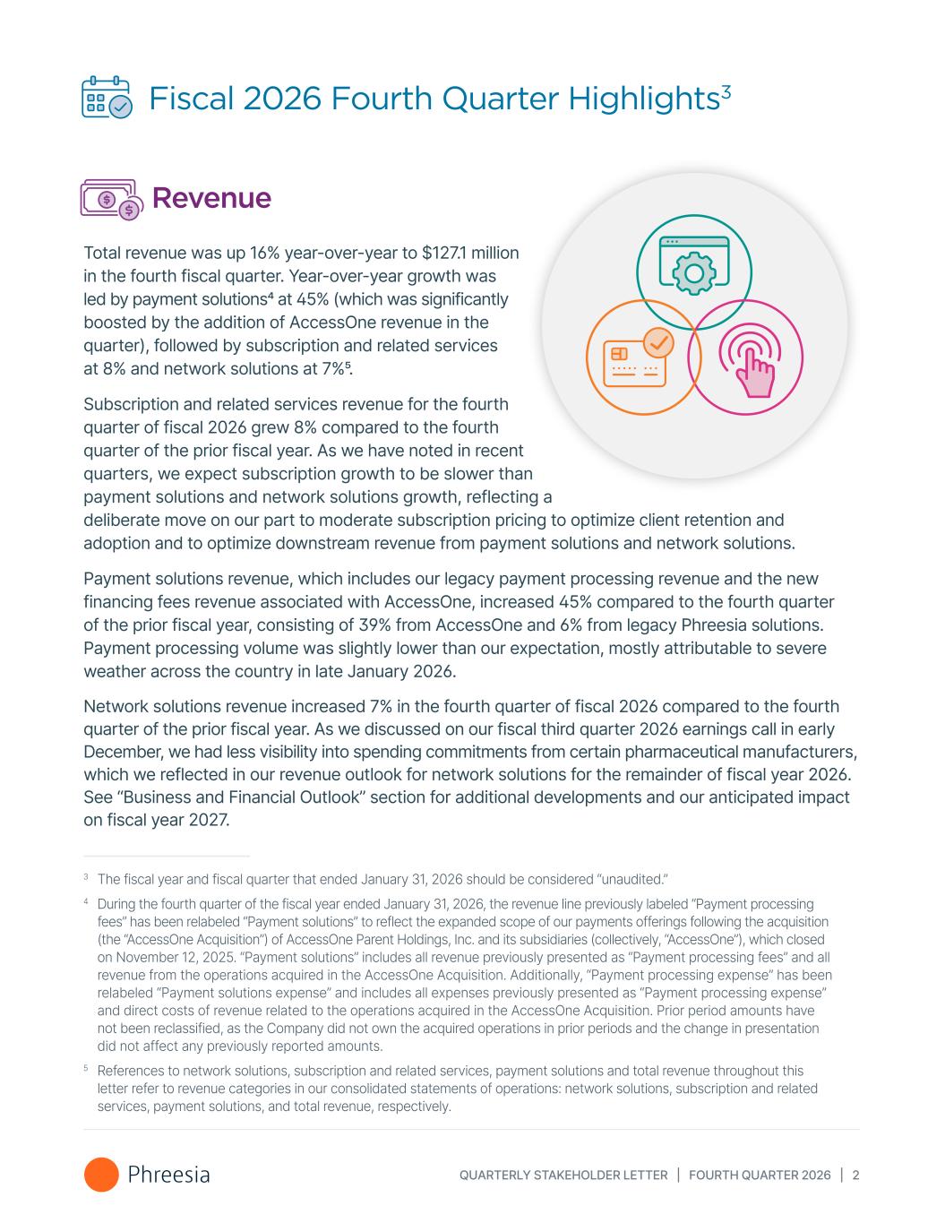 QUARTERLY STAKEHOLDER LETTER | FOURTH QUARTER 2026 | 2 Fiscal 2026 Fourth Quarter Highlights3 Revenue Total revenue was up 16% year-over-year to $127.1 million in the fourth fiscal quarter. Year-over-year growth was led by payment solutions4 at 45% (which was significantly boosted by the addition of AccessOne revenue in the quarter), followed by subscription and related services at 8% and network solutions at 7%5. Subscription and related services revenue for the fourth quarter of fiscal 2026 grew 8% compared to the fourth quarter of the prior fiscal year. As we have noted in recent quarters, we expect subscription growth to be slower than payment solutions and network solutions growth, reflecting a deliberate move on our part to moderate subscription pricing to optimize client retention and adoption and to optimize downstream revenue from payment solutions and network solutions. Payment solutions revenue, which includes our legacy payment processing revenue and the new financing fees revenue associated with AccessOne, increased 45% compared to the fourth quarter of the prior fiscal year, consisting of 39% from AccessOne and 6% from legacy Phreesia solutions. Payment processing volume was slightly lower than our expectation, mostly attributable to severe weather across the country in late January 2026. Network solutions revenue increased 7% in the fourth quarter of fiscal 2026 compared to the fourth quarter of the prior fiscal year. As we discussed on our fiscal third quarter 2026 earnings call in early December, we had less visibility into spending commitments from certain pharmaceutical manufacturers, which we reflected in our revenue outlook for network solutions for the remainder of fiscal year 2026. See “Business and Financial Outlook” section for additional developments and our anticipated impact on fiscal year 2027. 3 The fiscal year and fiscal quarter that ended January 31, 2026 should be considered “unaudited.” 4 During the fourth quarter of the fiscal year ended January 31, 2026, the revenue line previously labeled “Payment processing fees” has been relabeled “Payment solutions” to reflect the expanded scope of our payments offerings following the acquisition (the “AccessOne Acquisition”) of AccessOne Parent Holdings, Inc. and its subsidiaries (collectively, “AccessOne”), which closed on November 12, 2025. “Payment solutions” includes all revenue previously presented as “Payment processing fees” and all revenue from the operations acquired in the AccessOne Acquisition. Additionally, “Payment processing expense” has been relabeled “Payment solutions expense” and includes all expenses previously presented as “Payment processing expense” and direct costs of revenue related to the operations acquired in the AccessOne Acquisition. Prior period amounts have not been reclassified, as the Company did not own the acquired operations in prior periods and the change in presentation did not affect any previously reported amounts. 5 References to network solutions, subscription and related services, payment solutions and total revenue throughout this letter refer to revenue categories in our consolidated statements of operations: network solutions, subscription and related services, payment solutions, and total revenue, respectively.