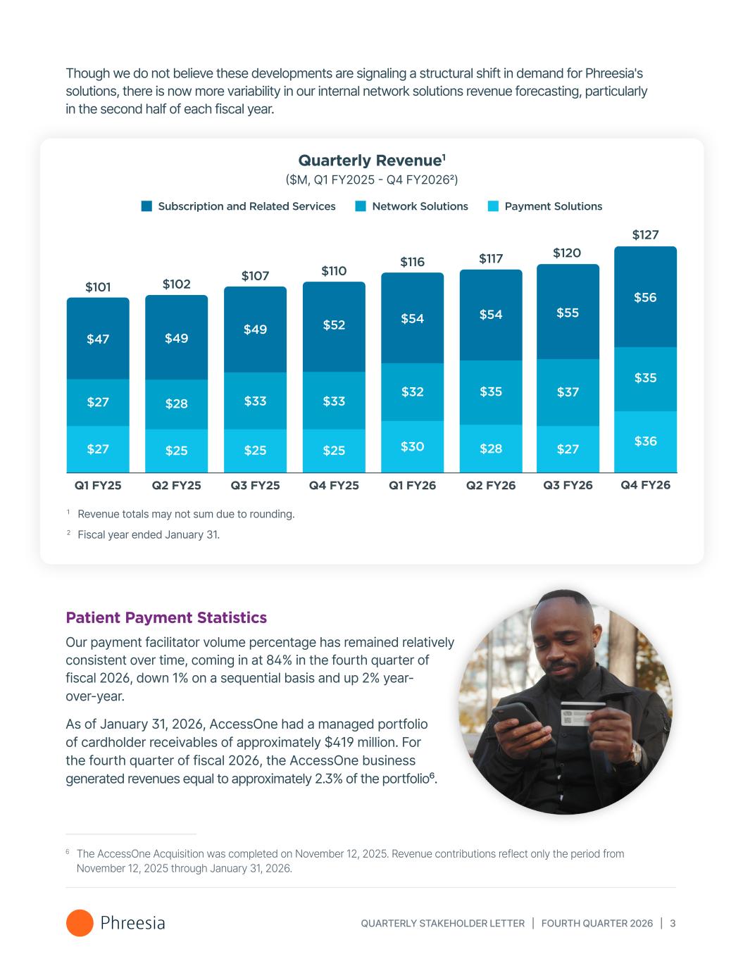 QUARTERLY STAKEHOLDER LETTER | FOURTH QUARTER 2026 | 3 Patient Payment Statistics Our payment facilitator volume percentage has remained relatively consistent over time, coming in at 84% in the fourth quarter of fiscal 2026, down 1% on a sequential basis and up 2% year- over-year. As of January 31, 2026, AccessOne had a managed portfolio of cardholder receivables of approximately $419 million. For the fourth quarter of fiscal 2026, the AccessOne business generated revenues equal to approximately 2.3% of the portfolio⁶. Quarterly Revenue1 ($M, Q1 FY2025 - Q4 FY20262) 1 Revenue totals may not sum due to rounding. 2 Fiscal year ended January 31. Subscription and Related Services Payment SolutionsNetwork Solutions Q3 FY26 $55 $37 $27 $120 $47 $27 $27 $49 $28 $25 $49 $33 $25 $52 $33 $25 $54 $32 $30 $101 $102 $107 $110 $116 Q1 FY25 Q2 FY25 Q3 FY25 Q4 FY25 Q1 FY26 Q2 FY26 $54 $35 $28 $117 Q4 FY26 $56 $35 $36 $127 6 The AccessOne Acquisition was completed on November 12, 2025. Revenue contributions reflect only the period from November 12, 2025 through January 31, 2026. Though we do not believe these developments are signaling a structural shift in demand for Phreesia's solutions, there is now more variability in our internal network solutions revenue forecasting, particularly in the second half of each fiscal year.