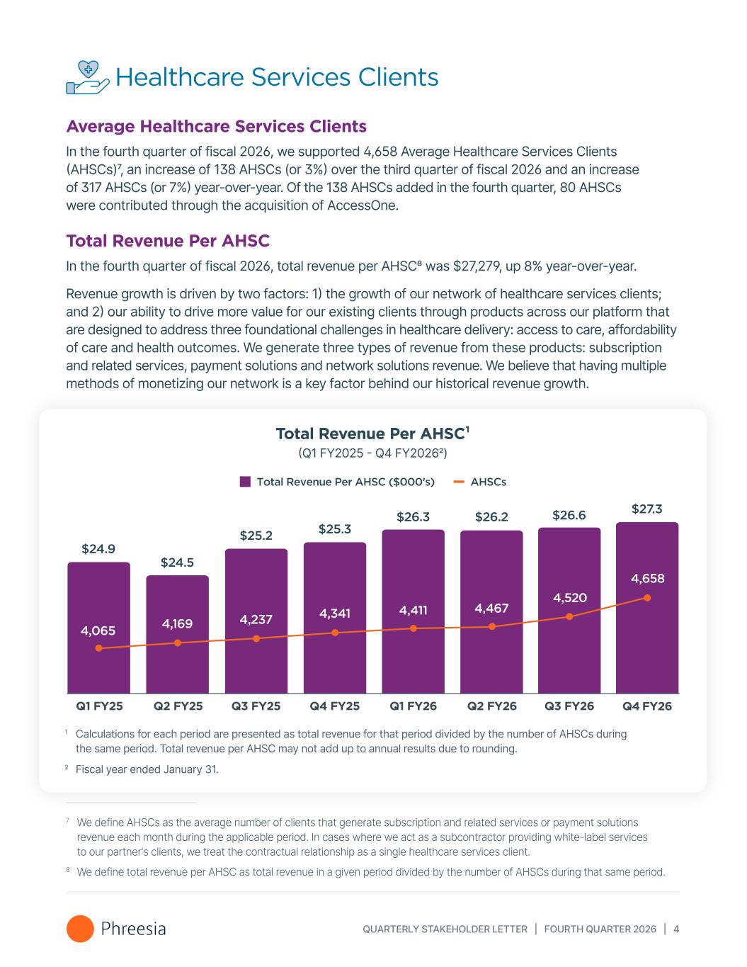 QUARTERLY STAKEHOLDER LETTER | FOURTH QUARTER 2026 | 4 Healthcare Services Clients Average Healthcare Services Clients In the fourth quarter of fiscal 2026, we supported 4,658 Average Healthcare Services Clients (AHSCs)7, an increase of 138 AHSCs (or 3%) over the third quarter of fiscal 2026 and an increase of 317 AHSCs (or 7%) year-over-year. Of the 138 AHSCs added in the fourth quarter, 80 AHSCs were contributed through the acquisition of AccessOne. Total Revenue Per AHSC In the fourth quarter of fiscal 2026, total revenue per AHSC8 was $27,279, up 8% year-over-year. Revenue growth is driven by two factors: 1) the growth of our network of healthcare services clients; and 2) our ability to drive more value for our existing clients through products across our platform that are designed to address three foundational challenges in healthcare delivery: access to care, affordability of care and health outcomes. We generate three types of revenue from these products: subscription and related services, payment solutions and network solutions revenue. We believe that having multiple methods of monetizing our network is a key factor behind our historical revenue growth. 7 We define AHSCs as the average number of clients that generate subscription and related services or payment solutions revenue each month during the applicable period. In cases where we act as a subcontractor providing white-label services to our partner's clients, we treat the contractual relationship as a single healthcare services client. 8 We define total revenue per AHSC as total revenue in a given period divided by the number of AHSCs during that same period. Total Revenue Per AHSC ($000’s) AHSCs 6 4,658 $27.3 Q4 FY2 4,520 $26.6 Q3 FY26 4,065 4,169 4,237 4,341 4,411 $24.9 $24.5 $25.2 $25.3 $26.3 Q1 FY25 Q2 FY25 Q3 FY25 Q4 FY25 Q1 FY26 Q2 FY26 $26.2 4,467 Total Revenue Per AHSC¹ (Q1 FY2025 - Q4 FY20262) 1 Calculations for each period are presented as total revenue for that period divided by the number of AHSCs during the same period. Total revenue per AHSC may not add up to annual results due to rounding. 2 Fiscal year ended January 31.
