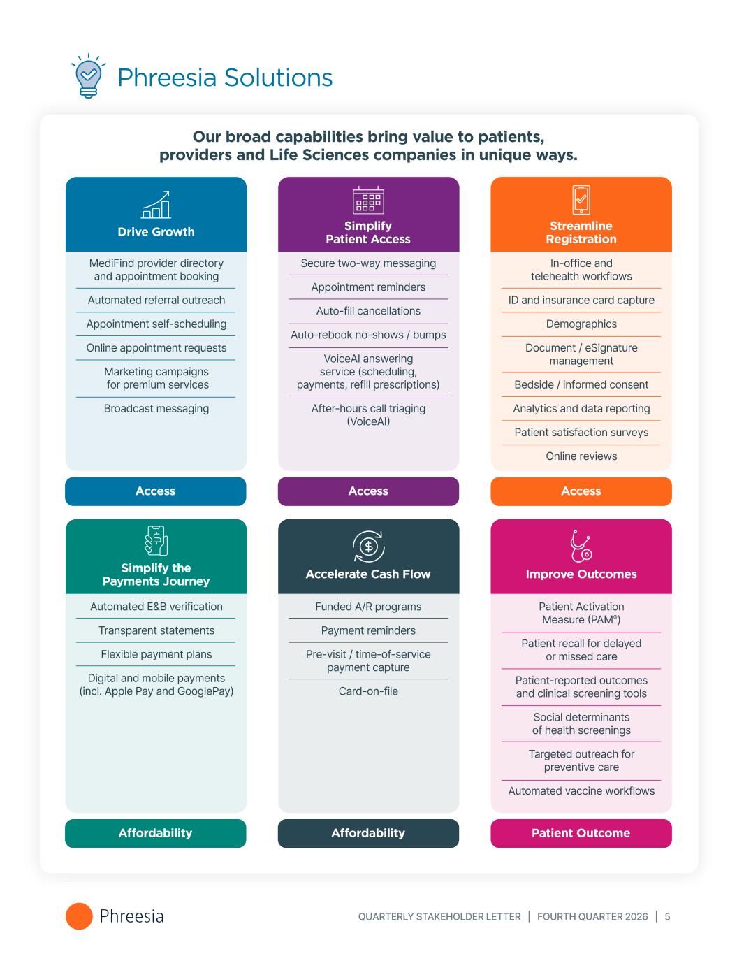 QUARTERLY STAKEHOLDER LETTER | FOURTH QUARTER 2026 | 5 Phreesia Solutions Our broad capabilities bring value to patients, providers and Life Sciences companies in unique ways. Streamline Registration In-office and telehealth workflows ID and insurance card capture Demographics Document / eSignature management Bedside / informed consent Analytics and data reporting Patient satisfaction surveys Online reviews Simplify Patient Access Secure two-way messaging Appointment reminders Auto-fill cancellations Auto-rebook no-shows / bumps VoiceAI answering service (scheduling, payments, refill prescriptions) After-hours call triaging (VoiceAI) Drive Growth MediFind provider directory and appointment booking Automated referral outreach Appointment self-scheduling Online appointment requests Marketing campaigns for premium services Broadcast messaging Improve Outcomes Patient Activation Measure (PAM®) Patient recall for delayed or missed care Patient-reported outcomes and clinical screening tools Social determinants of health screenings Targeted outreach for preventive care Automated vaccine workflows Accelerate Cash Flow Funded A/R programs Payment reminders Pre-visit / time-of-service  payment capture Card-on-file Simplify the Payments Journey Automated E&B verification Transparent statements Flexible payment plans Digital and mobile payments (incl. Apple Pay and GooglePay) Access Access Access Affordability Affordability Patient Outcome