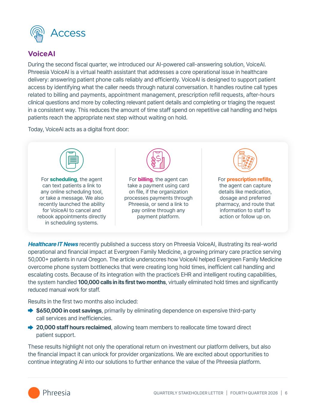 QUARTERLY STAKEHOLDER LETTER | FOURTH QUARTER 2026 | 6 Access VoiceAI During the second fiscal quarter, we introduced our AI-powered call-answering solution, VoiceAI. Phreesia VoiceAI is a virtual health assistant that addresses a core operational issue in healthcare delivery: answering patient phone calls reliably and efficiently. VoiceAI is designed to support patient access by identifying what the caller needs through natural conversation. It handles routine call types related to billing and payments, appointment management, prescription refill requests, after-hours clinical questions and more by collecting relevant patient details and completing or triaging the request in a consistent way. This reduces the amount of time staff spend on repetitive call handling and helps patients reach the appropriate next step without waiting on hold. Today, VoiceAI acts as a digital front door: For scheduling, the agent can text patients a link to any online scheduling tool, or take a message. We also recently launched the ability for VoiceAI to cancel and rebook appointments directly in scheduling systems. For billing, the agent can take a payment using card on file, if the organization processes payments through Phreesia, or send a link to pay online through any payment platform. For prescription refills, the agent can capture details like medication, dosage and preferred pharmacy, and route that information to staff to action or follow up on. Healthcare IT News recently published a success story on Phreesia VoiceAI, illustrating its real-world operational and financial impact at Evergreen Family Medicine, a growing primary care practice serving 50,000+ patients in rural Oregon. The article underscores how VoiceAI helped Evergreen Family Medicine overcome phone system bottlenecks that were creating long hold times, inefficient call handling and escalating costs. Because of its integration with the practice’s EHR and intelligent routing capabilities, the system handled 100,000 calls in its first two months, virtually eliminated hold times and significantly reduced manual work for staff. Results in the first two months also included: $650,000 in cost savings, primarily by eliminating dependence on expensive third-party call services and inefficiencies. 20,000 staff hours reclaimed, allowing team members to reallocate time toward direct patient support. These results highlight not only the operational return on investment our platform delivers, but also the financial impact it can unlock for provider organizations. We are excited about opportunities to continue integrating AI into our solutions to further enhance the value of the Phreesia platform.