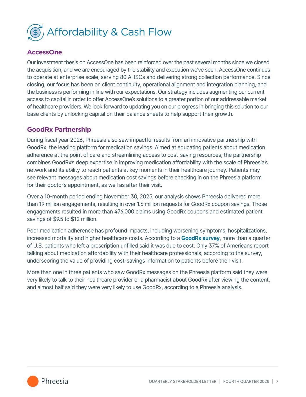 QUARTERLY STAKEHOLDER LETTER | FOURTH QUARTER 2026 | 7 Affordability & Cash Flow AccessOne Our investment thesis on AccessOne has been reinforced over the past several months since we closed the acquisition, and we are encouraged by the stability and execution we’ve seen. AccessOne continues to operate at enterprise scale, serving 80 AHSCs and delivering strong collection performance. Since closing, our focus has been on client continuity, operational alignment and integration planning, and the business is performing in line with our expectations. Our strategy includes augmenting our current access to capital in order to offer AccessOne’s solutions to a greater portion of our addressable market of healthcare providers. We look forward to updating you on our progress in bringing this solution to our base clients by unlocking capital on their balance sheets to help support their growth. GoodRx Partnership During fiscal year 2026, Phreesia also saw impactful results from an innovative partnership with GoodRx, the leading platform for medication savings. Aimed at educating patients about medication adherence at the point of care and streamlining access to cost-saving resources, the partnership combines GoodRx’s deep expertise in improving medication affordability with the scale of Phreesia’s network and its ability to reach patients at key moments in their healthcare journey. Patients may see relevant messages about medication cost savings before checking in on the Phreesia platform for their doctor’s appointment, as well as after their visit. Over a 10-month period ending November 30, 2025, our analysis shows Phreesia delivered more than 19 million engagements, resulting in over 1.6 million requests for GoodRx coupon savings. Those engagements resulted in more than 476,000 claims using GoodRx coupons and estimated patient savings of $9.5 to $12 million. Poor medication adherence has profound impacts, including worsening symptoms, hospitalizations, increased mortality and higher healthcare costs. According to a GoodRx survey, more than a quarter of U.S. patients who left a prescription unfilled said it was due to cost. Only 37% of Americans report talking about medication affordability with their healthcare professionals, according to the survey, underscoring the value of providing cost-savings information to patients before their visit. More than one in three patients who saw GoodRx messages on the Phreesia platform said they were very likely to talk to their healthcare provider or a pharmacist about GoodRx after viewing the content, and almost half said they were very likely to use GoodRx, according to a Phreesia analysis.
