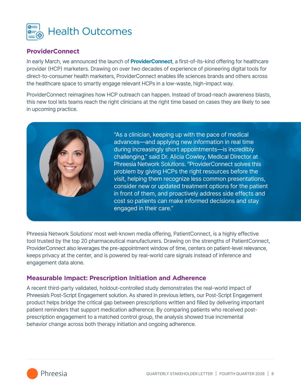 QUARTERLY STAKEHOLDER LETTER | FOURTH QUARTER 2026 | 8 Phreesia Network Solutions’ most well-known media offering, PatientConnect, is a highly effective tool trusted by the top 20 pharmaceutical manufacturers. Drawing on the strengths of PatientConnect, ProviderConnect also leverages the pre-appointment window of time, centers on patient-level relevance, keeps privacy at the center, and is powered by real-world care signals instead of inference and engagement data alone. Measurable Impact: Prescription Initiation and Adherence A recent third-party validated, holdout-controlled study demonstrates the real-world impact of Phreesia’s Post-Script Engagement solution. As shared in previous letters, our Post-Script Engagement product helps bridge the critical gap between prescriptions written and filled by delivering important patient reminders that support medication adherence. By comparing patients who received post- prescription engagement to a matched control group, the analysis showed true incremental behavior change across both therapy initiation and ongoing adherence. "As a clinician, keeping up with the pace of medical advances—and applying new information in real time during increasingly short appointments—is incredibly challenging," said Dr. Alicia Cowley, Medical Director at Phreesia Network Solutions. "ProviderConnect solves this problem by giving HCPs the right resources before the visit, helping them recognize less common presentations, consider new or updated treatment options for the patient in front of them, and proactively address side effects and cost so patients can make informed decisions and stay engaged in their care.” Health Outcomes ProviderConnect In early March, we announced the launch of ProviderConnect, a first-of-its-kind offering for healthcare provider (HCP) marketers. Drawing on over two decades of experience of pioneering digital tools for direct-to-consumer health marketers, ProviderConnect enables life sciences brands and others across the healthcare space to smartly engage relevant HCPs in a low-waste, high-impact way. ProviderConnect reimagines how HCP outreach can happen. Instead of broad-reach awareness blasts, this new tool lets teams reach the right clinicians at the right time based on cases they are likely to see in upcoming practice.