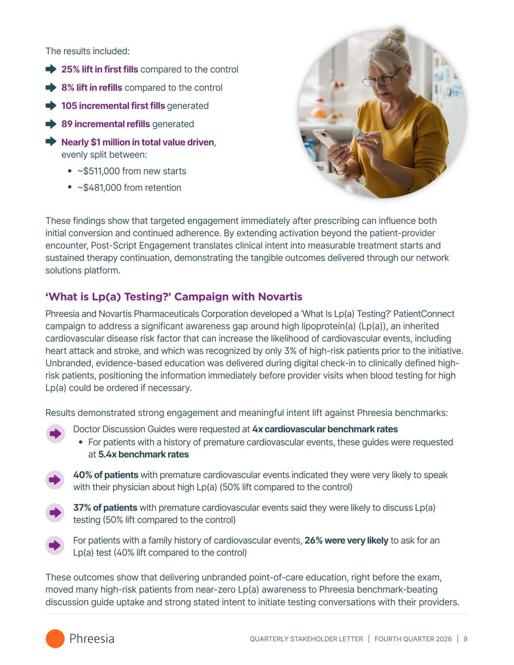 QUARTERLY STAKEHOLDER LETTER | FOURTH QUARTER 2026 | 9 The results included: 25% lift in first fills compared to the control 8% lift in refills compared to the control 105 incremental first fills generated 89 incremental refills generated Nearly $1 million in total value driven, evenly split between: ~$511,000 from new starts ~$481,000 from retention These findings show that targeted engagement immediately after prescribing can influence both initial conversion and continued adherence. By extending activation beyond the patient-provider encounter, Post-Script Engagement translates clinical intent into measurable treatment starts and sustained therapy continuation, demonstrating the tangible outcomes delivered through our network solutions platform. ‘What is Lp(a) Testing?’ Campaign with Novartis Phreesia and Novartis Pharmaceuticals Corporation developed a ‘What Is Lp(a) Testing?’ PatientConnect campaign to address a significant awareness gap around high lipoprotein(a) (Lp(a)), an inherited cardiovascular disease risk factor that can increase the likelihood of cardiovascular events, including heart attack and stroke, and which was recognized by only 3% of high-risk patients prior to the initiative. Unbranded, evidence-based education was delivered during digital check-in to clinically defined high- risk patients, positioning the information immediately before provider visits when blood testing for high Lp(a) could be ordered if necessary. Results demonstrated strong engagement and meaningful intent lift against Phreesia benchmarks: Doctor Discussion Guides were requested at 4x cardiovascular benchmark rates For patients with a history of premature cardiovascular events, these guides were requested at 5.4x benchmark rates 40% of patients with premature cardiovascular events indicated they were very likely to speak with their physician about high Lp(a) (50% lift compared to the control) 37% of patients with premature cardiovascular events said they were likely to discuss Lp(a) testing (50% lift compared to the control) For patients with a family history of cardiovascular events, 26% were very likely to ask for an Lp(a) test (40% lift compared to the control) These outcomes show that delivering unbranded point-of-care education, right before the exam, moved many high-risk patients from near-zero Lp(a) awareness to Phreesia benchmark-beating discussion guide uptake and strong stated intent to initiate testing conversations with their providers.