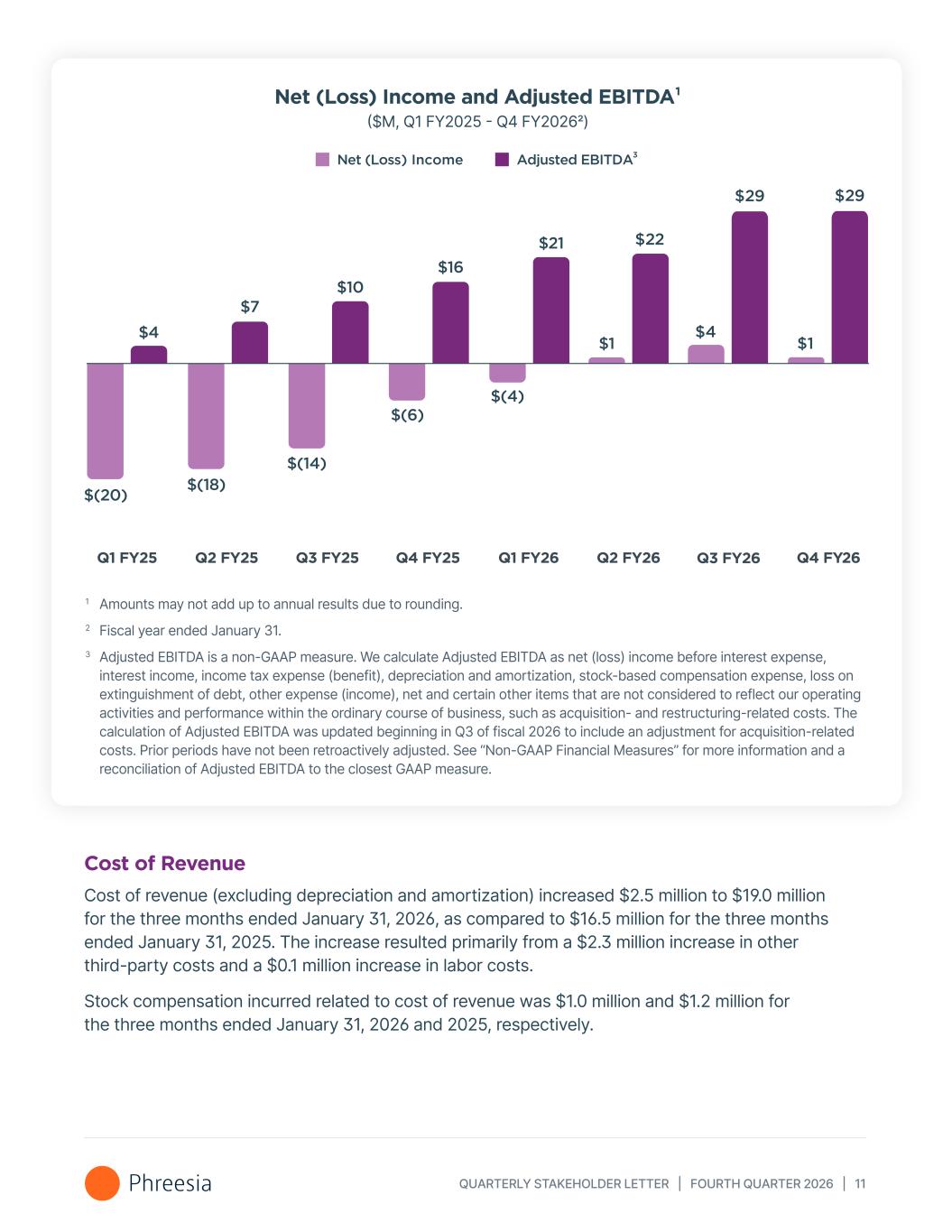 QUARTERLY STAKEHOLDER LETTER | FOURTH QUARTER 2026 | 11 1 Amounts may not add up to annual results due to rounding. 2 Fiscal year ended January 31. 3 Adjusted EBITDA is a non-GAAP measure. We calculate Adjusted EBITDA as net (loss) income before interest expense, interest income, income tax expense (benefit), depreciation and amortization, stock-based compensation expense, loss on extinguishment of debt, other expense (income), net and certain other items that are not considered to reflect our operating activities and performance within the ordinary course of business, such as acquisition- and restructuring-related costs. The calculation of Adjusted EBITDA was updated beginning in Q3 of fiscal 2026 to include an adjustment for acquisition-related costs. Prior periods have not been retroactively adjusted. See “Non-GAAP Financial Measures” for more information and a reconciliation of Adjusted EBITDA to the closest GAAP measure. Net (Loss) Income and Adjusted EBITDA¹ ($M, Q1 FY2025 - Q4 FY20262) Net (Loss) Income Adjusted EBITDA Q2 FY26Q1 FY25 Q2 FY25 Q3 FY25 Q4 FY25 Q1 FY26 $(20) $(18) $(14) $(6) $4 $7 $10 $16 $21 $(4) $ $1 $4 22 $29 Q3 FY26 $1 $29 Q4 FY26 Cost of Revenue Cost of revenue (excluding depreciation and amortization) increased $2.5 million to $19.0 million for the three months ended January 31, 2026, as compared to $16.5 million for the three months ended January 31, 2025. The increase resulted primarily from a $2.3 million increase in other third-party costs and a $0.1 million increase in labor costs. Stock compensation incurred related to cost of revenue was $1.0 million and $1.2 million for the three months ended January 31, 2026 and 2025, respectively.
