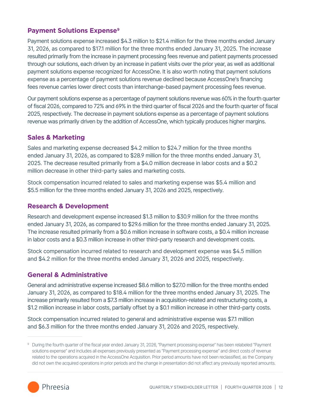 QUARTERLY STAKEHOLDER LETTER | FOURTH QUARTER 2026 | 12 Payment Solutions Expense9 Payment solutions expense increased $4.3 million to $21.4 million for the three months ended January  31, 2026, as compared to $17.1 million for the three months ended January 31, 2025. The increase resulted primarily from the increase in payment processing fees revenue and patient payments processed through our solutions, each driven by an increase in patient visits over the prior year, as well as additional payment solutions expense recognized for AccessOne. It is also worth noting that payment solutions expense as a percentage of payment solutions revenue declined because AccessOne's financing fees revenue carries lower direct costs than interchange-based payment processing fees revenue. Our payment solutions expense as a percentage of payment solutions revenue was 60% in the fourth quarter of fiscal 2026, compared to 72% and 69% in the third quarter of fiscal 2026 and the fourth quarter of fiscal 2025, respectively. The decrease in payment solutions expense as a percentage of payment solutions revenue was primarily driven by the addition of AccessOne, which typically produces higher margins. Sales & Marketing Sales and marketing expense decreased $4.2 million to $24.7 million for the three months ended January 31, 2026, as compared to $28.9 million for the three months ended January 31, 2025. The decrease resulted primarily from a $4.0 million decrease in labor costs and a $0.2 million decrease in other third-party sales and marketing costs. Stock compensation incurred related to sales and marketing expense was $5.4 million and $5.5 million for the three months ended January 31, 2026 and 2025, respectively. Research & Development Research and development expense increased $1.3 million to $30.9 million for the three months ended January 31, 2026, as compared to $29.6 million for the three months ended January 31, 2025. The increase resulted primarily from a $0.6 million increase in software costs, a $0.4 million increase in labor costs and a $0.3 million increase in other third-party research and development costs. Stock compensation incurred related to research and development expense was $4.5 million and $4.2 million for the three months ended January 31, 2026 and 2025, respectively. General & Administrative General and administrative expense increased $8.6 million to $27.0 million for the three months ended January 31, 2026, as compared to $18.4 million for the three months ended January 31, 2025. The increase primarily resulted from a $7.3 million increase in acquisition-related and restructuring costs, a $1.2 million increase in labor costs, partially offset by a $0.1 million increase in other third-party costs. Stock compensation incurred related to general and administrative expense was $7.1 million and $6.3 million for the three months ended January 31, 2026 and 2025, respectively. 9 During the fourth quarter of the fiscal year ended January 31, 2026, “Payment processing expense” has been relabeled “Payment solutions expense” and includes all expenses previously presented as “Payment processing expense” and direct costs of revenue related to the operations acquired in the AccessOne Acquisition. Prior period amounts have not been reclassified, as the Company did not own the acquired operations in prior periods and the change in presentation did not affect any previously reported amounts.