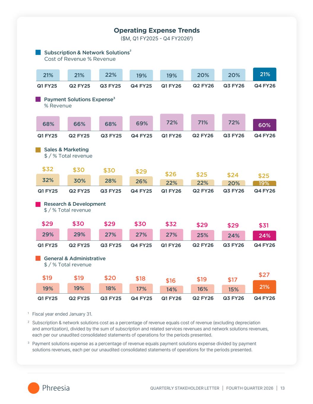 QUARTERLY STAKEHOLDER LETTER | FOURTH QUARTER 2026 | 13 Operating Expense Trends ($M, Q1 FY2025 - Q4 FY20261) 1 Fiscal year ended January 31. 2 Subscription & network solutions cost as a percentage of revenue equals cost of revenue (excluding depreciation and amortization), divided by the sum of subscription and related services revenues and network solutions revenues, each per our unaudited consolidated statements of operations for the periods presented. 3 Payment solutions expense as a percentage of revenue equals payment solutions expense divided by payment solutions revenues, each per our unaudited consolidated statements of operations for the periods presented. Q3 FY26 Q3 FY26 Q3 FY26 Q3 FY26 Q3 FY26 20% 20% $24 24% $29 15% $17 72% 19% Sales & Marketing $ / % Total revenue 22% $26 32% $32 Research & Development $ / % Total revenue 27% $32 29% $29 General & Administrative $ / % Total revenue 14% $16 19% $19 Payment Solutions Expense3 % Revenue 72%68% Subscription & Network Solutions Cost of Revenue % Revenue 21% 21% 66% 30% $30 29% $30 19% $19 22% 68% 28% $30 27% $29 18% $20 19% 69% 26% $29 27% $30 17% $18 Q2 FY26Q1 FY25 Q2 FY25 Q3 FY25 Q4 FY25 Q1 FY26 Q2 FY26Q1 FY25 Q2 FY25 Q3 FY25 Q4 FY25 Q1 FY26 Q2 FY26Q1 FY25 Q2 FY25 Q3 FY25 Q4 FY25 Q1 FY26 Q2 FY26Q1 FY25 Q2 FY25 Q3 FY25 Q4 FY25 Q1 FY26 Q2 FY26Q1 FY25 Q2 FY25 Q3 FY25 Q4 FY25 Q1 FY26 20% 22% $25 25% $29 16% $19 71% Q4 FY26 Q4 FY26 Q4 FY26 Q4 FY26 Q4 FY26 21% 19% $25 24% $31 21% $27 60%