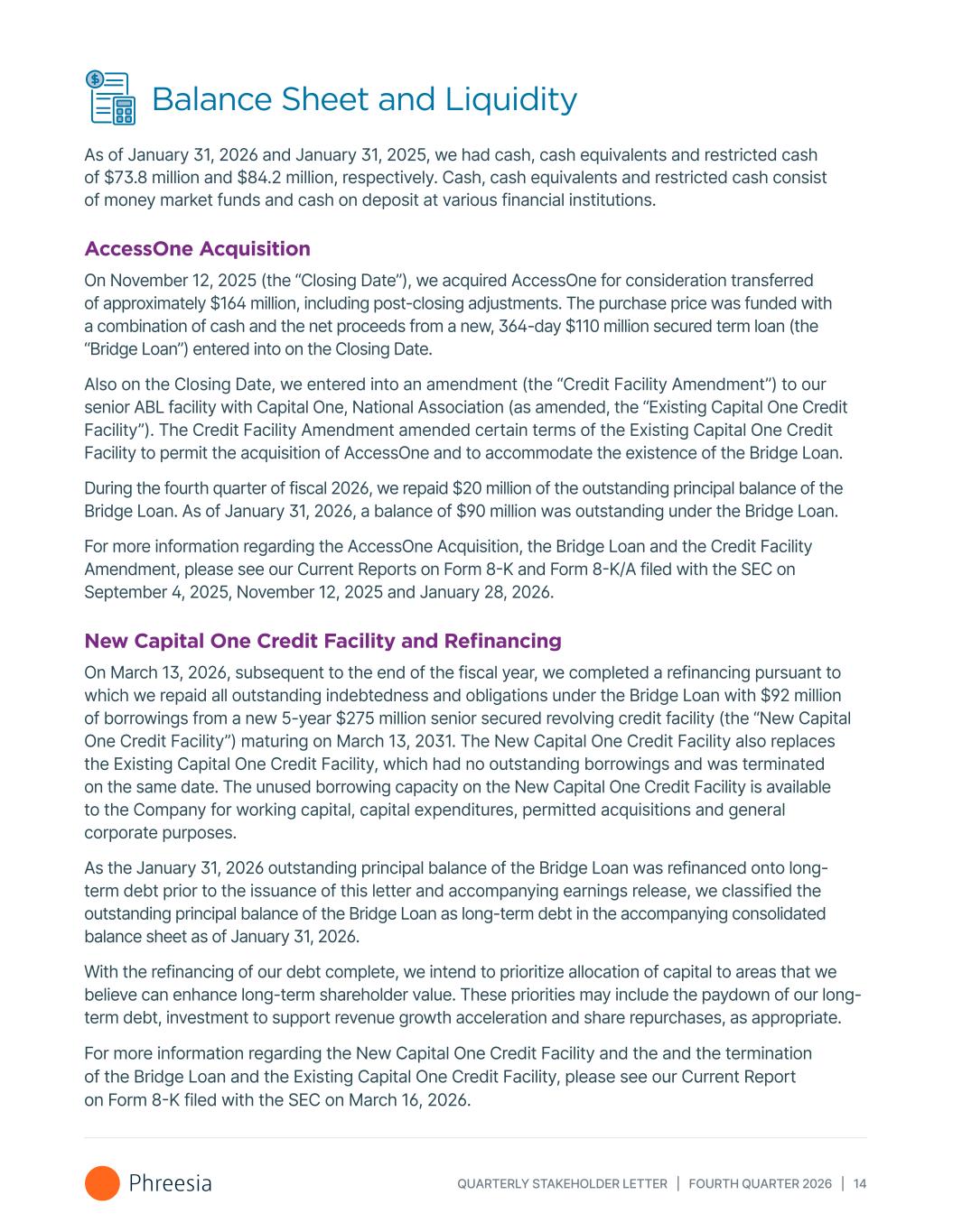 QUARTERLY STAKEHOLDER LETTER | FOURTH QUARTER 2026 | 14 Balance Sheet and Liquidity As of January 31, 2026 and January 31, 2025, we had cash, cash equivalents and restricted cash of $73.8 million and $84.2 million, respectively. Cash, cash equivalents and restricted cash consist of money market funds and cash on deposit at various financial institutions. AccessOne Acquisition On November 12, 2025 (the “Closing Date”), we acquired AccessOne for consideration transferred of approximately $164 million, including post-closing adjustments. The purchase price was funded with a combination of cash and the net proceeds from a new, 364-day $110 million secured term loan (the “Bridge Loan”) entered into on the Closing Date. Also on the Closing Date, we entered into an amendment (the “Credit Facility Amendment”) to our senior ABL facility with Capital One, National Association (as amended, the “Existing Capital One Credit Facility”). The Credit Facility Amendment amended certain terms of the Existing Capital One Credit Facility to permit the acquisition of AccessOne and to accommodate the existence of the Bridge Loan. During the fourth quarter of fiscal 2026, we repaid $20 million of the outstanding principal balance of the Bridge Loan. As of January 31, 2026, a balance of $90 million was outstanding under the Bridge Loan. For more information regarding the AccessOne Acquisition, the Bridge Loan and the Credit Facility Amendment, please see our Current Reports on Form 8-K and Form 8-K/A filed with the SEC on September 4, 2025, November 12, 2025 and January 28, 2026. New Capital One Credit Facility and Refinancing On March 13, 2026, subsequent to the end of the fiscal year, we completed a refinancing pursuant to which we repaid all outstanding indebtedness and obligations under the Bridge Loan with $92 million of borrowings from a new 5-year $275 million senior secured revolving credit facility (the “New Capital One Credit Facility”) maturing on March 13, 2031. The New Capital One Credit Facility also replaces the Existing Capital One Credit Facility, which had no outstanding borrowings and was terminated on the same date. The unused borrowing capacity on the New Capital One Credit Facility is available to the Company for working capital, capital expenditures, permitted acquisitions and general corporate purposes. As the January 31, 2026 outstanding principal balance of the Bridge Loan was refinanced onto long- term debt prior to the issuance of this letter and accompanying earnings release, we classified the outstanding principal balance of the Bridge Loan as long-term debt in the accompanying consolidated balance sheet as of January 31, 2026. With the refinancing of our debt complete, we intend to prioritize allocation of capital to areas that we believe can enhance long-term shareholder value. These priorities may include the paydown of our long- term debt, investment to support revenue growth acceleration and share repurchases, as appropriate. For more information regarding the New Capital One Credit Facility and the and the termination of the Bridge Loan and the Existing Capital One Credit Facility, please see our Current Report on Form 8-K filed with the SEC on March 16, 2026.