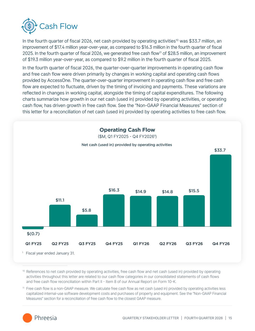 QUARTERLY STAKEHOLDER LETTER | FOURTH QUARTER 2026 | 15 Cash Flow In the fourth quarter of fiscal 2026, net cash provided by operating activities10 was $33.7 million, an improvement of $17.4 million year-over-year, as compared to $16.3 million in the fourth quarter of fiscal 2025. In the fourth quarter of fiscal 2026, we generated free cash flow11 of $28.5 million, an improvement of $19.3 million year-over-year, as compared to $9.2 million in the fourth quarter of fiscal 2025. In the fourth quarter of fiscal 2026, the quarter-over-quarter improvements in operating cash flow and free cash flow were driven primarily by changes in working capital and operating cash flows provided by AccessOne. The quarter-over-quarter improvement in operating cash flow and free cash flow are expected to fluctuate, driven by the timing of invoicing and payments. These variations are reflected in changes in working capital, alongside the timing of capital expenditures. The following charts summarize how growth in our net cash (used in) provided by operating activities, or operating cash flow, has driven growth in free cash flow. See the “Non-GAAP Financial Measures” section of this letter for a reconciliation of net cash (used in) provided by operating activities to free cash flow. 10 References to net cash provided by operating activities, free cash flow and net cash (used in) provided by operating activities throughout this letter are related to our cash flow categories in our consolidated statements of cash flows and free cash flow reconciliation within Part II - Item 8 of our Annual Report on Form 10-K. 11 Free cash flow is a non-GAAP measure. We calculate free cash flow as net cash (used in) provided by operating activities less capitalized internal-use software development costs and purchases of property and equipment. See the “Non-GAAP Financial Measures” section for a reconciliation of free cash flow to the closest GAAP measure. Operating Cash Flow ($M, Q1 FY2025 - Q4 FY20261) 1 Fiscal year ended January 31. Net cash (used in) provided by operating activities Q4 FY26 $15.5$14.8 $11.1 $5.8 $16.3 Q2 FY26Q1 FY25 Q2 FY25 Q3 FY25 Q4 FY25 Q1 FY26 $(0.7) $14.9 Q3 FY26 $33.7