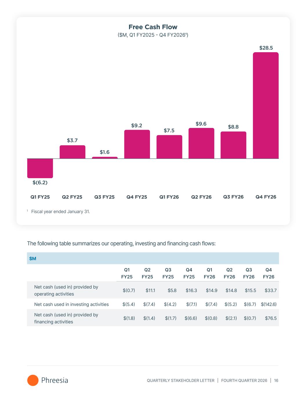 QUARTERLY STAKEHOLDER LETTER | FOURTH QUARTER 2026 | 16 Q3 FY26 $8.8 $3.7 $1.6 $9.2 Q2 FY26Q1 FY25 Q2 FY25 Q3 FY25 Q4 FY25 Q1 FY26 $(6.2) $7.5 $9.6 Q4 FY26 $28.5 Free Cash Flow ($M, Q1 FY2025 - Q4 FY20261) 1 Fiscal year ended January 31. The following table summarizes our operating, investing and financing cash flows: $M Q1 FY25 Q2 FY25 Q3 FY25 Q4 FY25 Q1 FY26 Q2 FY26 Q3 FY26 Q4 FY26 Net cash (used in) provided by operating activities $(0.7) $11.1 $5.8 $16.3 $14.9 $14.8 $15.5 $33.7 Net cash used in investing activities $(5.4) $(7.4) $(4.2) $(7.1) $(7.4) $(5.2) $(6.7) $(142.6) Net cash (used in) provided by financing activities $(1.8) $(1.4) $(1.7) $(6.6) $(0.8) $(2.1) $(0.7) $76.5
