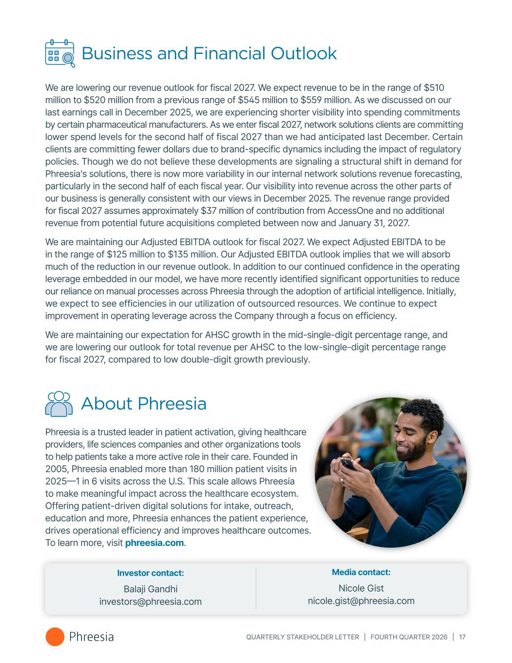 QUARTERLY STAKEHOLDER LETTER | FOURTH QUARTER 2026 | 17 Business and Financial Outlook We are lowering our revenue outlook for fiscal 2027. We expect revenue to be in the range of $510 million to $520 million from a previous range of $545 million to $559 million. As we discussed on our last earnings call in December 2025, we are experiencing shorter visibility into spending commitments by certain pharmaceutical manufacturers. As we enter fiscal 2027, network solutions clients are committing lower spend levels for the second half of fiscal 2027 than we had anticipated last December. Certain clients are committing fewer dollars due to brand-specific dynamics including the impact of regulatory policies. Though we do not believe these developments are signaling a structural shift in demand for Phreesia's solutions, there is now more variability in our internal network solutions revenue forecasting, particularly in the second half of each fiscal year. Our visibility into revenue across the other parts of our business is generally consistent with our views in December 2025. The revenue range provided for fiscal 2027 assumes approximately $37 million of contribution from AccessOne and no additional revenue from potential future acquisitions completed between now and January 31, 2027. We are maintaining our Adjusted EBITDA outlook for fiscal 2027. We expect Adjusted EBITDA to be in the range of $125 million to $135 million. Our Adjusted EBITDA outlook implies that we will absorb much of the reduction in our revenue outlook. In addition to our continued confidence in the operating leverage embedded in our model, we have more recently identified significant opportunities to reduce our reliance on manual processes across Phreesia through the adoption of artificial intelligence. Initially, we expect to see efficiencies in our utilization of outsourced resources. We continue to expect improvement in operating leverage across the Company through a focus on efficiency. We are maintaining our expectation for AHSC growth in the mid-single-digit percentage range, and we are lowering our outlook for total revenue per AHSC to the low-single-digit percentage range for fiscal 2027, compared to low double-digit growth previously. About Phreesia Phreesia is a trusted leader in patient activation, giving healthcare providers, life sciences companies and other organizations tools to help patients take a more active role in their care. Founded in 2005, Phreesia enabled more than 180 million patient visits in 2025—1 in 6 visits across the U.S. This scale allows Phreesia to make meaningful impact across the healthcare ecosystem. Offering patient-driven digital solutions for intake, outreach, education and more, Phreesia enhances the patient experience, drives operational efficiency and improves healthcare outcomes. To learn more, visit phreesia.com. Media contact: Nicole Gist nicole.gist@phreesia.com Investor contact: Balaji Gandhi investors@phreesia.com