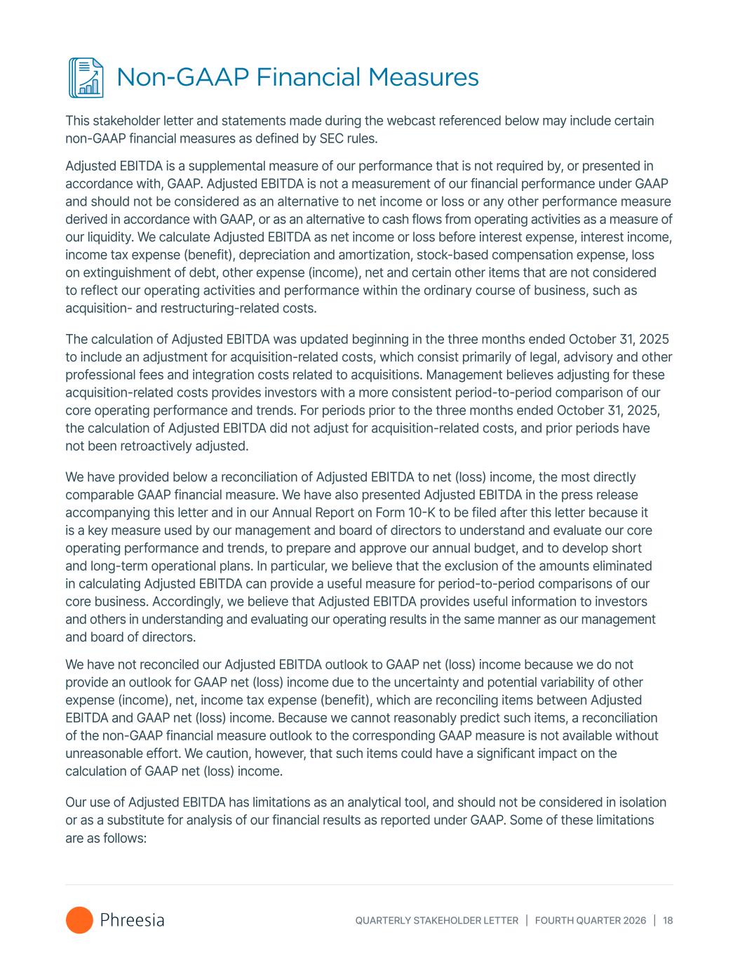 QUARTERLY STAKEHOLDER LETTER | FOURTH QUARTER 2026 | 18 Non-GAAP Financial Measures This stakeholder letter and statements made during the webcast referenced below may include certain non-GAAP financial measures as defined by SEC rules. Adjusted EBITDA is a supplemental measure of our performance that is not required by, or presented in accordance with, GAAP. Adjusted EBITDA is not a measurement of our financial performance under GAAP and should not be considered as an alternative to net income or loss or any other performance measure derived in accordance with GAAP, or as an alternative to cash flows from operating activities as a measure of our liquidity. We calculate Adjusted EBITDA as net income or loss before interest expense, interest income, income tax expense (benefit), depreciation and amortization, stock-based compensation expense, loss on extinguishment of debt, other expense (income), net and certain other items that are not considered to reflect our operating activities and performance within the ordinary course of business, such as acquisition- and restructuring-related costs. The calculation of Adjusted EBITDA was updated beginning in the three months ended October 31, 2025 to include an adjustment for acquisition-related costs, which consist primarily of legal, advisory and other professional fees and integration costs related to acquisitions. Management believes adjusting for these acquisition-related costs provides investors with a more consistent period-to-period comparison of our core operating performance and trends. For periods prior to the three months ended October 31, 2025, the calculation of Adjusted EBITDA did not adjust for acquisition-related costs, and prior periods have not been retroactively adjusted. We have provided below a reconciliation of Adjusted EBITDA to net (loss) income, the most directly comparable GAAP financial measure. We have also presented Adjusted EBITDA in the press release accompanying this letter and in our Annual Report on Form 10-K to be filed after this letter because it is a key measure used by our management and board of directors to understand and evaluate our core operating performance and trends, to prepare and approve our annual budget, and to develop short and long-term operational plans. In particular, we believe that the exclusion of the amounts eliminated in calculating Adjusted EBITDA can provide a useful measure for period-to-period comparisons of our core business. Accordingly, we believe that Adjusted EBITDA provides useful information to investors and others in understanding and evaluating our operating results in the same manner as our management and board of directors. We have not reconciled our Adjusted EBITDA outlook to GAAP net (loss) income because we do not provide an outlook for GAAP net (loss) income due to the uncertainty and potential variability of other expense (income), net, income tax expense (benefit), which are reconciling items between Adjusted EBITDA and GAAP net (loss) income. Because we cannot reasonably predict such items, a reconciliation of the non-GAAP financial measure outlook to the corresponding GAAP measure is not available without unreasonable effort. We caution, however, that such items could have a significant impact on the calculation of GAAP net (loss) income. Our use of Adjusted EBITDA has limitations as an analytical tool, and should not be considered in isolation or as a substitute for analysis of our financial results as reported under GAAP. Some of these limitations are as follows: