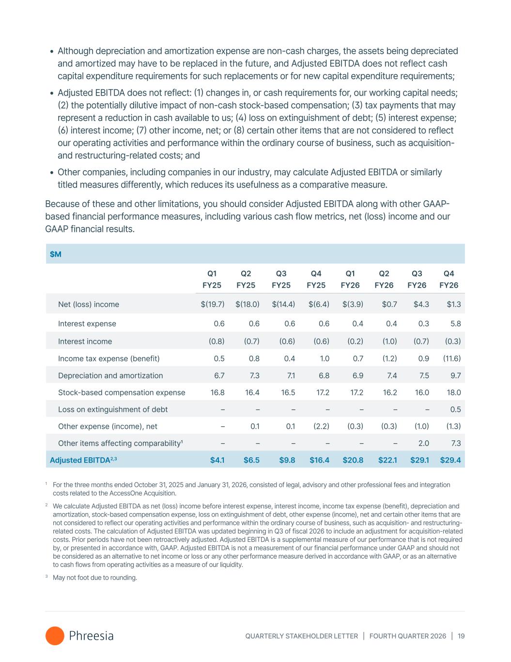 QUARTERLY STAKEHOLDER LETTER | FOURTH QUARTER 2026 | 19 • Although depreciation and amortization expense are non-cash charges, the assets being depreciated and amortized may have to be replaced in the future, and Adjusted EBITDA does not reflect cash capital expenditure requirements for such replacements or for new capital expenditure requirements; • Adjusted EBITDA does not reflect: (1) changes in, or cash requirements for, our working capital needs; (2) the potentially dilutive impact of non-cash stock-based compensation; (3) tax payments that may represent a reduction in cash available to us; (4) loss on extinguishment of debt; (5) interest expense; (6) interest income; (7) other income, net; or (8) certain other items that are not considered to reflect our operating activities and performance within the ordinary course of business, such as acquisition- and restructuring-related costs; and • Other companies, including companies in our industry, may calculate Adjusted EBITDA or similarly titled measures differently, which reduces its usefulness as a comparative measure. Because of these and other limitations, you should consider Adjusted EBITDA along with other GAAP- based financial performance measures, including various cash flow metrics, net (loss) income and our GAAP financial results. $M Q1 FY25 Q2 FY25 Q3 FY25 Q4 FY25 Q1 FY26 Q2 FY26 Q3 FY26 Q4 FY26 Net (loss) income $(19.7) $(18.0) $(14.4) $(6.4) $(3.9) $0.7 $4.3 $1.3 Interest expense 0.6 0.6 0.6 0.6 0.4 0.4 0.3 5.8 Interest income (0.8) (0.7) (0.6) (0.6) (0.2) (1.0) (0.7) (0.3) Income tax expense (benefit) 0.5 0.8 0.4 1.0 0.7 (1.2) 0.9 (11.6) Depreciation and amortization 6.7 7.3 7.1 6.8 6.9 7.4 7.5 9.7 Stock-based compensation expense 16.8 16.4 16.5 17.2 17.2 16.2 16.0 18.0 Loss on extinguishment of debt – – – – – – – 0.5 Other expense (income), net – 0.1 0.1 (2.2) (0.3) (0.3) (1.0) (1.3) Other items affecting comparability1 – – – – – – 2.0 7.3 Adjusted EBITDA2,3 $4.1 $6.5 $9.8 $16.4 $20.8 $22.1 $29.1 $29.4 1 For the three months ended October 31, 2025 and January 31, 2026, consisted of legal, advisory and other professional fees and integration costs related to the AccessOne Acquisition. 2 We calculate Adjusted EBITDA as net (loss) income before interest expense, interest income, income tax expense (benefit), depreciation and amortization, stock-based compensation expense, loss on extinguishment of debt, other expense (income), net and certain other items that are not considered to reflect our operating activities and performance within the ordinary course of business, such as acquisition- and restructuring- related costs. The calculation of Adjusted EBITDA was updated beginning in Q3 of fiscal 2026 to include an adjustment for acquisition-related costs. Prior periods have not been retroactively adjusted. Adjusted EBITDA is a supplemental measure of our performance that is not required by, or presented in accordance with, GAAP. Adjusted EBITDA is not a measurement of our financial performance under GAAP and should not be considered as an alternative to net income or loss or any other performance measure derived in accordance with GAAP, or as an alternative to cash flows from operating activities as a measure of our liquidity. 3 May not foot due to rounding.