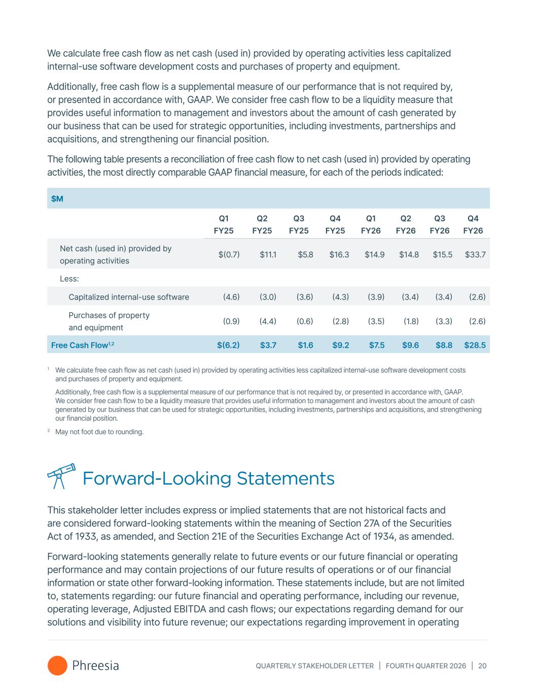 QUARTERLY STAKEHOLDER LETTER | FOURTH QUARTER 2026 | 20 We calculate free cash flow as net cash (used in) provided by operating activities less capitalized internal-use software development costs and purchases of property and equipment. Additionally, free cash flow is a supplemental measure of our performance that is not required by, or presented in accordance with, GAAP. We consider free cash flow to be a liquidity measure that provides useful information to management and investors about the amount of cash generated by our business that can be used for strategic opportunities, including investments, partnerships and acquisitions, and strengthening our financial position. The following table presents a reconciliation of free cash flow to net cash (used in) provided by operating activities, the most directly comparable GAAP financial measure, for each of the periods indicated: $M Q1 FY25 Q2 FY25 Q3 FY25 Q4 FY25 Q1 FY26 Q2 FY26 Q3 FY26 Q4 FY26 Net cash (used in) provided by operating activities $(0.7) $11.1 $5.8 $16.3 $14.9 $14.8 $15.5 $33.7 Less: Capitalized internal-use software (4.6) (3.0) (3.6) (4.3) (3.9) (3.4) (3.4) (2.6) Purchases of property and equipment (0.9) (4.4) (0.6) (2.8) (3.5) (1.8) (3.3) (2.6) Free Cash Flow1,2 $(6.2) $3.7 $1.6 $9.2 $7.5 $9.6 $8.8 $28.5 1 We calculate free cash flow as net cash (used in) provided by operating activities less capitalized internal-use software development costs and purchases of property and equipment. Additionally, free cash flow is a supplemental measure of our performance that is not required by, or presented in accordance with, GAAP. We consider free cash flow to be a liquidity measure that provides useful information to management and investors about the amount of cash generated by our business that can be used for strategic opportunities, including investments, partnerships and acquisitions, and strengthening our financial position. 2 May not foot due to rounding. Forward-Looking Statements This stakeholder letter includes express or implied statements that are not historical facts and are considered forward-looking statements within the meaning of Section 27A of the Securities Act of 1933, as amended, and Section 21E of the Securities Exchange Act of 1934, as amended. Forward-looking statements generally relate to future events or our future financial or operating performance and may contain projections of our future results of operations or of our financial information or state other forward-looking information. These statements include, but are not limited to, statements regarding: our future financial and operating performance, including our revenue, operating leverage, Adjusted EBITDA and cash flows; our expectations regarding demand for our solutions and visibility into future revenue; our expectations regarding improvement in operating
