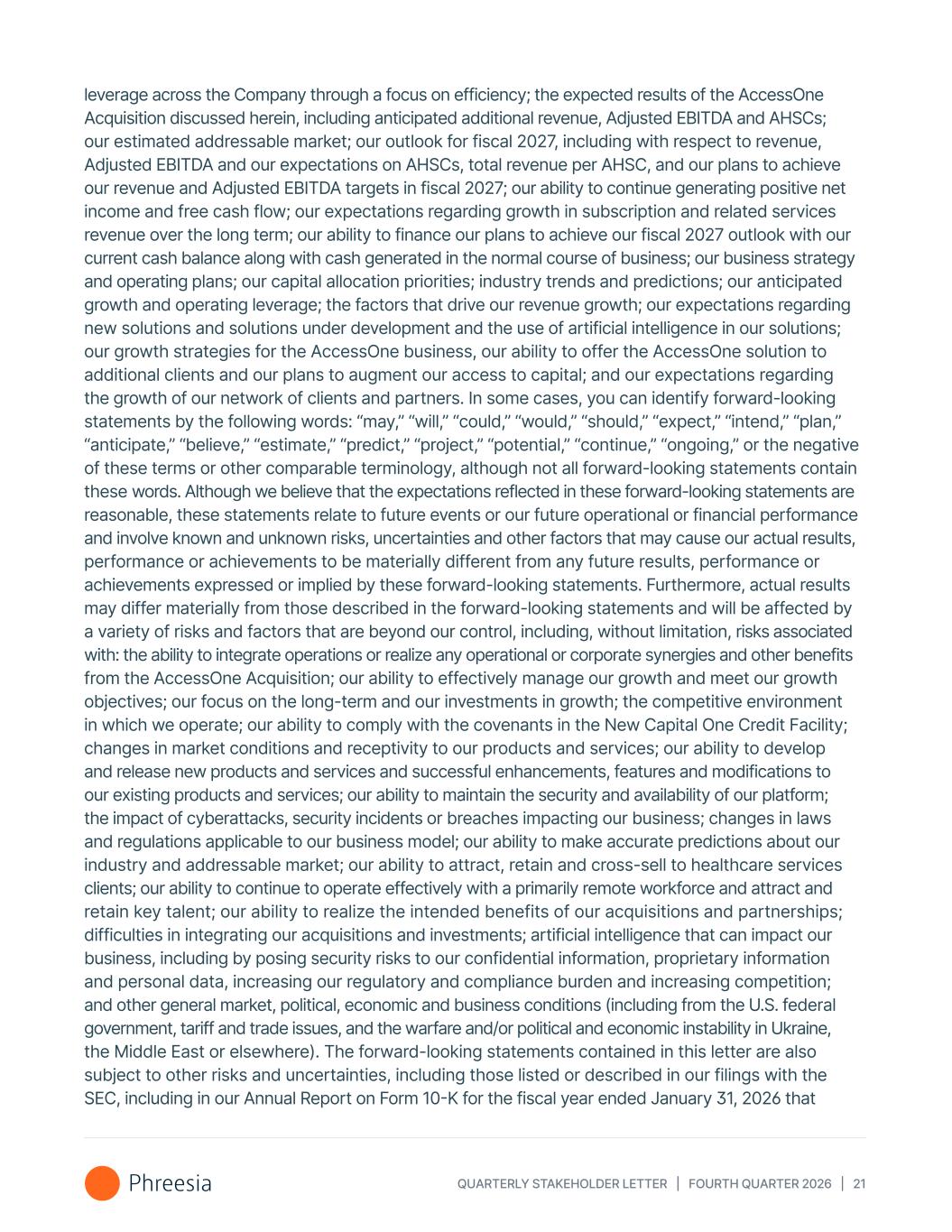 QUARTERLY STAKEHOLDER LETTER | FOURTH QUARTER 2026 | 21 leverage across the Company through a focus on efficiency; the expected results of the AccessOne Acquisition discussed herein, including anticipated additional revenue, Adjusted EBITDA and AHSCs; our estimated addressable market; our outlook for fiscal 2027, including with respect to revenue, Adjusted EBITDA and our expectations on AHSCs, total revenue per AHSC, and our plans to achieve our revenue and Adjusted EBITDA targets in fiscal 2027; our ability to continue generating positive net income and free cash flow; our expectations regarding growth in subscription and related services revenue over the long term; our ability to finance our plans to achieve our fiscal 2027 outlook with our current cash balance along with cash generated in the normal course of business; our business strategy and operating plans; our capital allocation priorities; industry trends and predictions; our anticipated growth and operating leverage; the factors that drive our revenue growth; our expectations regarding new solutions and solutions under development and the use of artificial intelligence in our solutions; our growth strategies for the AccessOne business, our ability to offer the AccessOne solution to additional clients and our plans to augment our access to capital; and our expectations regarding the growth of our network of clients and partners. In some cases, you can identify forward-looking statements by the following words: “may,” “will,” “could,” “would,” “should,” “expect,” “intend,” “plan,” “anticipate,” “believe,” “estimate,” “predict,” “project,” “potential,” “continue,” “ongoing,” or the negative of these terms or other comparable terminology, although not all forward-looking statements contain these words. Although we believe that the expectations reflected in these forward-looking statements are reasonable, these statements relate to future events or our future operational or financial performance and involve known and unknown risks, uncertainties and other factors that may cause our actual results, performance or achievements to be materially different from any future results, performance or achievements expressed or implied by these forward-looking statements. Furthermore, actual results may differ materially from those described in the forward-looking statements and will be affected by a variety of risks and factors that are beyond our control, including, without limitation, risks associated with: the ability to integrate operations or realize any operational or corporate synergies and other benefits from the AccessOne Acquisition; our ability to effectively manage our growth and meet our growth objectives; our focus on the long-term and our investments in growth; the competitive environment in which we operate; our ability to comply with the covenants in the New Capital One Credit Facility; changes in market conditions and receptivity to our products and services; our ability to develop and release new products and services and successful enhancements, features and modifications to our existing products and services; our ability to maintain the security and availability of our platform; the impact of cyberattacks, security incidents or breaches impacting our business; changes in laws and regulations applicable to our business model; our ability to make accurate predictions about our industry and addressable market; our ability to attract, retain and cross-sell to healthcare services clients; our ability to continue to operate effectively with a primarily remote workforce and attract and retain key talent; our ability to realize the intended benefits of our acquisitions and partnerships; difficulties in integrating our acquisitions and investments; artificial intelligence that can impact our business, including by posing security risks to our confidential information, proprietary information and personal data, increasing our regulatory and compliance burden and increasing competition; and other general market, political, economic and business conditions (including from the U.S. federal government, tariff and trade issues, and the warfare and/or political and economic instability in Ukraine, the Middle East or elsewhere). The forward-looking statements contained in this letter are also subject to other risks and uncertainties, including those listed or described in our filings with the SEC, including in our Annual Report on Form 10-K for the fiscal year ended January 31, 2026 that