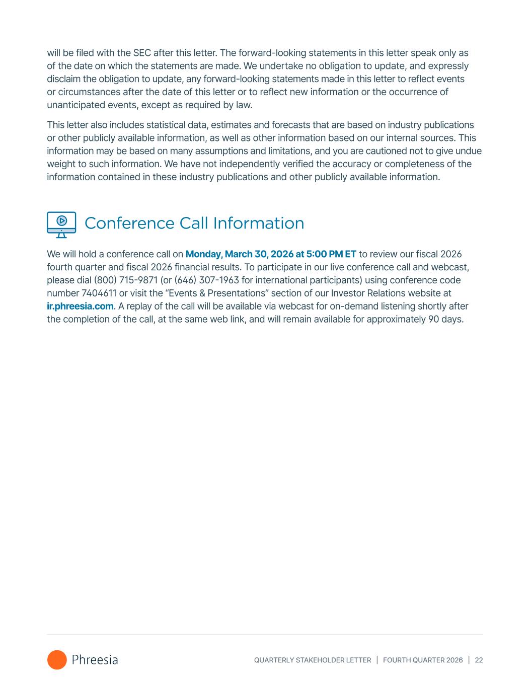 QUARTERLY STAKEHOLDER LETTER | FOURTH QUARTER 2026 | 22 will be filed with the SEC after this letter. The forward-looking statements in this letter speak only as of the date on which the statements are made. We undertake no obligation to update, and expressly disclaim the obligation to update, any forward-looking statements made in this letter to reflect events or circumstances after the date of this letter or to reflect new information or the occurrence of unanticipated events, except as required by law. This letter also includes statistical data, estimates and forecasts that are based on industry publications or other publicly available information, as well as other information based on our internal sources. This information may be based on many assumptions and limitations, and you are cautioned not to give undue weight to such information. We have not independently verified the accuracy or completeness of the information contained in these industry publications and other publicly available information. Conference Call Information We will hold a conference call on Monday, March 30, 2026 at 5:00 PM ET to review our fiscal 2026 fourth quarter and fiscal 2026 financial results. To participate in our live conference call and webcast, please dial (800) 715-9871 (or (646) 307-1963 for international participants) using conference code number 7404611 or visit the “Events & Presentations” section of our Investor Relations website at ir.phreesia.com. A replay of the call will be available via webcast for on-demand listening shortly after the completion of the call, at the same web link, and will remain available for approximately 90 days.