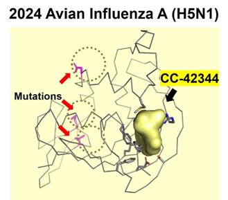 Cocrystal Pharma determined the high resolution X-ray crystal structure of the recent avian influenza A (H5N1) PB2 protein and confirmed activity of CC-42344 in vitro (NIH GeneBank ID:influenza A/Texas/37/2024(H5N1). The crystal structure of the avian influenza A (H5N1) PB2 protein showed new mutations located outside the PB2 active site. Subsequent studies showed that CC-42344 binds to the active site of the avian influenza A (H5N1) PB2 protein as previously demonstrated with the pandemic and seasonal influenza A PB2. Preliminary in vitro assays confirmed that CC-42344 exhibits high potency against the avian influenza A (H5N1) PB2 protein.
