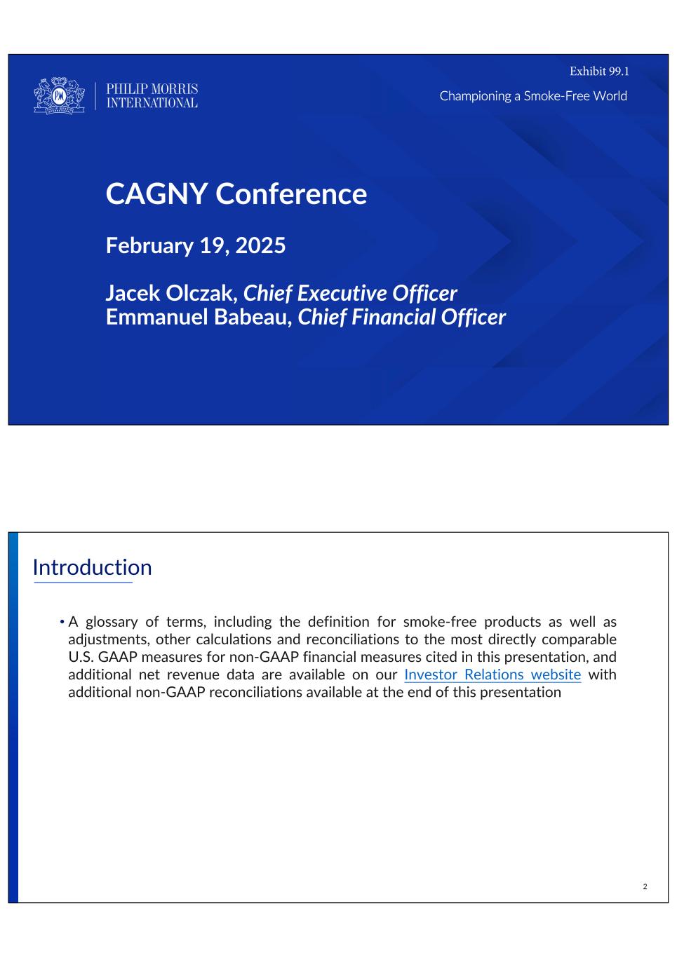 Championing a Smoke-Free World CAGNY Conference February 19, 2025 Jacek Olczak, Chief Executive Officer Emmanuel Babeau, Chief Financial Officer Introduction • A glossary of terms, including the definition for smoke-free products as well as adjustments, other calculations and reconciliations to the most directly comparable U.S. GAAP measures for non-GAAP financial measures cited in this presentation, and additional net revenue data are available on our Investor Relations website with additional non-GAAP reconciliations available at the end of this presentation 2 Exhibit 99.1