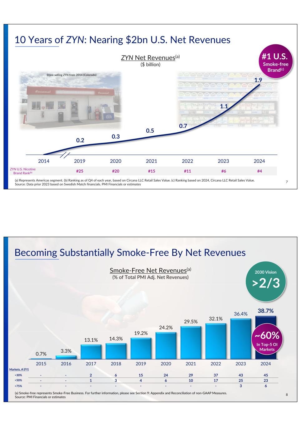 10 Years of ZYN: Nearing $2bn U.S. Net Revenues 7(a) Represents Americas segment. (b) Ranking as of Q4 of each year, based on Circana LLC Retail Sales Value. (c) Ranking based on 2024, Circana LLC Retail Sales Value. Source: Data prior 2023 based on Swedish Match financials. PMI Financials or estimates 0.2 0.3 0.5 0.7 1.1 1.9 2014 2019 2020 2021 2022 2023 2024 ZYN U.S. Nicotine Brand Rank(b) #25 #20 #15 #11 #6 #4 #1 U.S. Smoke-free Brand(c) Store selling ZYN from 2014 (Colorado) ZYN Net Revenues(a) ($ billion) Becoming Substantially Smoke-Free By Net Revenues 8 0.7% 3.3% 13.1% 14.3% 19.2% 24.2% 29.5% 32.1% 36.4% 38.7% 2015 2016 2017 2018 2019 2020 2021 2022 2023 2024 (a) Smoke-free represents Smoke-Free Business. For further information, please see Section 9: Appendix and Reconciliation of non-GAAP Measures. Source: PMI Financials or estimates ~60% In Top-5 OI Markets >2/3 2030 Vision 45433729241562-- 232517106431-- 63-------- Markets, # (FY) >30% >50% >75% Smoke-Free Net Revenues(a) (% of Total PMI Adj. Net Revenues)