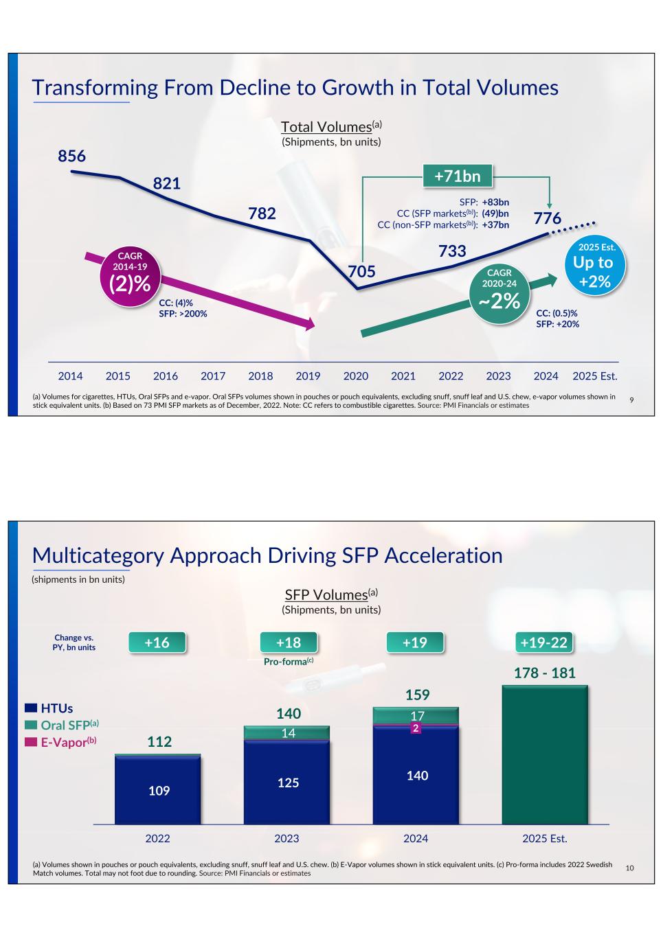 856 821 782 705 733 776 2014 2015 2016 2017 2018 2019 2020 2021 2022 2023 2024 2025 Est. Transforming From Decline to Growth in Total Volumes 9(a) Volumes for cigarettes, HTUs, Oral SFPs and e-vapor. Oral SFPs volumes shown in pouches or pouch equivalents, excluding snuff, snuff leaf and U.S. chew, e-vapor volumes shown in stick equivalent units. (b) Based on 73 PMI SFP markets as of December, 2022. Note: CC refers to combustible cigarettes. Source: PMI Financials or estimates ~2% CAGR 2020-24(2)% CAGR 2014-19 CC: (4)% SFP: >200% CC: (0.5)% SFP: +20% +71bn +83bn (49)bn +37bn SFP: CC (SFP markets(b)): CC (non-SFP markets(b)): Total Volumes(a) (Shipments, bn units) Up to +2% 2025 Est. 109 125 140 2 14 17 112 140 159 178 - 181 2022 2023 2024 2025 Est. Multicategory Approach Driving SFP Acceleration (shipments in bn units) Oral SFP(a) HTUs (a) Volumes shown in pouches or pouch equivalents, excluding snuff, snuff leaf and U.S. chew. (b) E-Vapor volumes shown in stick equivalent units. (c) Pro-forma includes 2022 Swedish Match volumes. Total may not foot due to rounding. Source: PMI Financials or estimates E-Vapor(b) Change vs. PY, bn units +19+18+16 +19-22 Pro-forma(c) 10 SFP Volumes(a) (Shipments, bn units)
