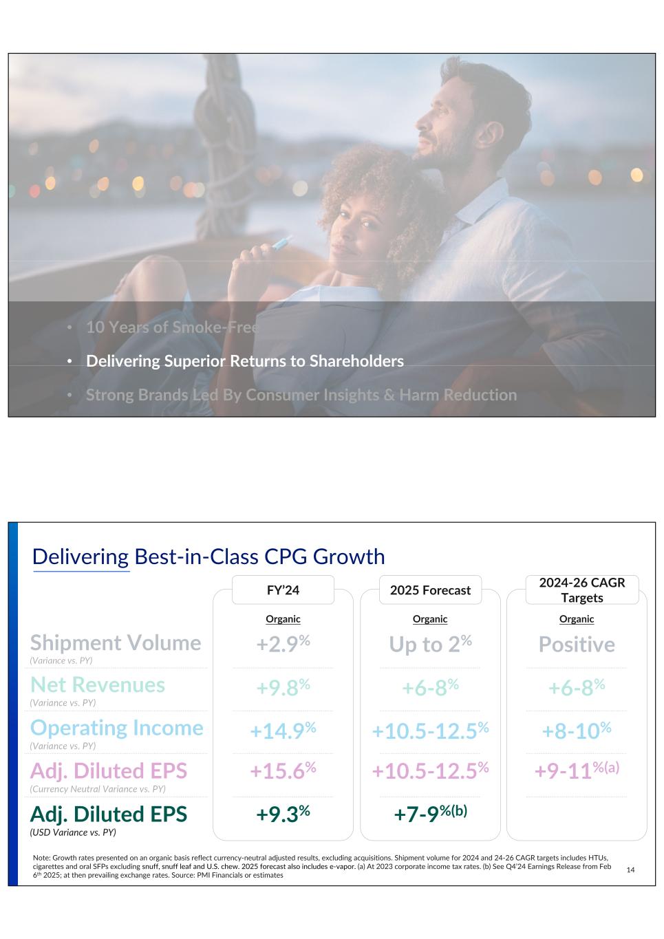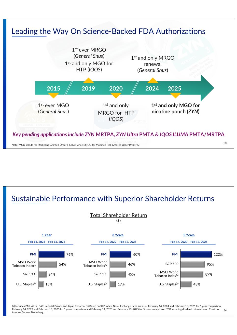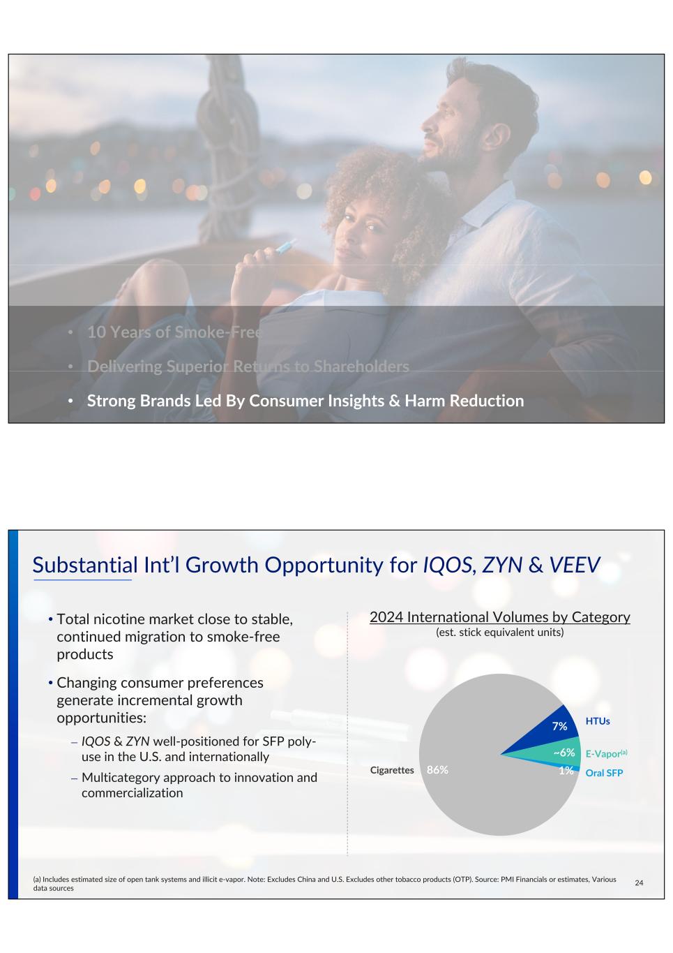 Forward-Looking and Cautionary Statements • This presentation contains projections of future results and goals and other forward-looking statements, including statements regarding expected financial or operational performance; capital allocation plans; investment strategies; market expectations; regulatory outcomes; business plans and strategies; and dividends. Achievement of future results is subject to risks, uncertainties and inaccurate assumptions. In the event that risks or uncertainties materialize, or underlying assumptions prove inaccurate, actual results could vary materially from those contained in such forward-looking statements. Pursuant to the “safe harbor” provisions of the Private Securities Litigation Reform Act of 1995, PMI is identifying important factors that, individually or in the aggregate, could cause actual results and outcomes to differ materially from those contained in any forward-looking statements made by PMI • PMI's business risks include: excise tax increases and discriminatory tax structures; increasing marketing and regulatory restrictions that could reduce our competitiveness, eliminate our ability to communicate with adult consumers, or ban certain of our products in certain markets or countries; health concerns relating to the use of tobacco and other nicotine-containing products and exposure to environmental tobacco smoke; litigation related to tobacco and / or nicotine use and intellectual property; intense competition; the effects of global and individual country economic, regulatory and political developments, natural disasters and conflicts; the impact and consequences of Russia's invasion of Ukraine; changes in adult smoker behavior; the impact of natural disasters and pandemics on PMI's business; lost revenues as a result of counterfeiting, contraband and cross-border purchases; governmental investigations; unfavorable currency exchange rates and currency devaluations, and limitations on the ability to repatriate funds; adverse changes in applicable corporate tax laws; adverse changes in the cost, availability, and quality of tobacco and other agricultural products and raw materials, as well as components and materials for our electronic devices; and the integrity of its information systems and effectiveness of its data privacy policies. PMI's future profitability may also be adversely affected should it be unsuccessful in its attempts to introduce, commercialize, and grow smoke-free products or if regulation or taxation do not differentiate between such products and cigarettes; if it is unable to successfully introduce new products, promote brand equity, enter new markets or improve its margins through increased prices and productivity gains; if it is unable to expand its brand portfolio internally or through acquisitions and the development of strategic business relationships; if it is unable to attract and retain the best global talent, including women or diverse candidates; or if it is unable to successfully integrate and realize the expected benefits from recent transactions and acquisitions. Future results are also subject to the lower predictability of our smoke-free business’ performance • PMI is further subject to other risks detailed from time to time in its publicly filed documents, including PMI’s Annual Report on Form 10-K for the fourth quarter and year ended December 31, 2024. PMI cautions that the foregoing list of important factors is not a complete discussion of all potential risks and uncertainties. PMI does not undertake to update any forward-looking statement that it may make from time to time, except in the normal course of its public disclosure obligations • References to “PMI”, “we”, “our” and “us” mean Philip Morris International Inc., and its subsidiaries 3 • 10 Years of Smoke-Free • Delivering Superior Returns to Shareholders • Strong Brands Led By Consumer Insights & Harm Reduction