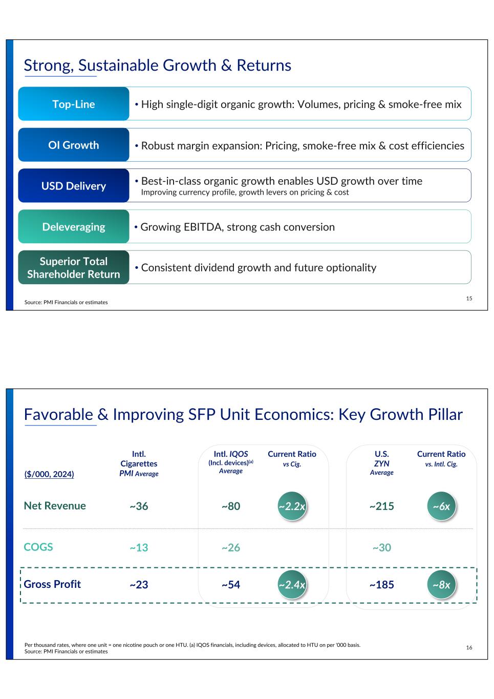 Strong, Sustainable Growth & Returns 15 Top-Line OI Growth USD Delivery Superior Total Shareholder Return • Robust margin expansion: Pricing, smoke-free mix & cost efficiencies • Growing EBITDA, strong cash conversion • Consistent dividend growth and future optionality • High single-digit organic growth: Volumes, pricing & smoke-free mix Deleveraging • Best-in-class organic growth enables USD growth over time Improving currency profile, growth levers on pricing & cost Source: PMI Financials or estimates Favorable & Improving SFP Unit Economics: Key Growth Pillar 16 Intl. Cigarettes PMI Average Intl. IQOS (Incl. devices)(a) Average($/000, 2024) Current Ratio vs Cig. U.S. ZYN Average COGS ~13 ~26 ~30 Current Ratio vs. Intl. Cig. Net Revenue ~36 ~80 ~215 ~6x~2.2x Gross Profit ~23 ~54 ~185 ~8x~2.4x Per thousand rates, where one unit = one nicotine pouch or one HTU. (a) IQOS financials, including devices, allocated to HTU on per '000 basis. Source: PMI Financials or estimates