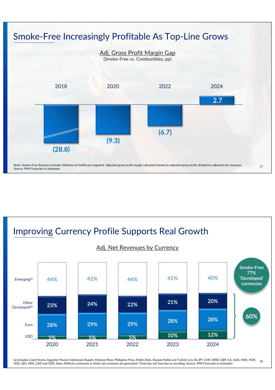 Smoke-Free Increasingly Profitable As Top-Line Grows 17Note: Smoke-Free Business includes Wellness & Healthcare segment. Adjusted gross profit margin calculated based on adjusted gross profit, divided by adjusted net revenues. Source: PMI Financials or estimates 2.7 (28.8) (9.3) (6.7) 2018 2020 2022 2024 Adj. Gross Profit Margin Gap (Smoke-Free vs. Combustibles, pp) (a) Includes Czech Krona, Egyptian Pound, Indonesian Rupiah, Mexican Peso, Philippine Peso, Polish Zloty, Russian Ruble and Turkish Lira. (b) JPY, CHF, KRW, GBP, ILS, AUD, HKD, NOK, SGD, SEK, DKK, CAD and NZD. Note: Reflects currencies in which net revenues are generated. Total may not foot due to rounding. Source: PMI Financials or estimates Improving Currency Profile Supports Real Growth 18 5% 5% 5% 10% 12% 28% 29% 29% 28% 28% 23% 24% 22% 21% 20% 44% 42% 44% 41% 40% 2020 2021 2022 2023 2024 Other Developed(b) Euro USD Emerging(a) Smoke-Free 77% ‘Developed’ currencies 60% Adj. Net Revenues by Currency