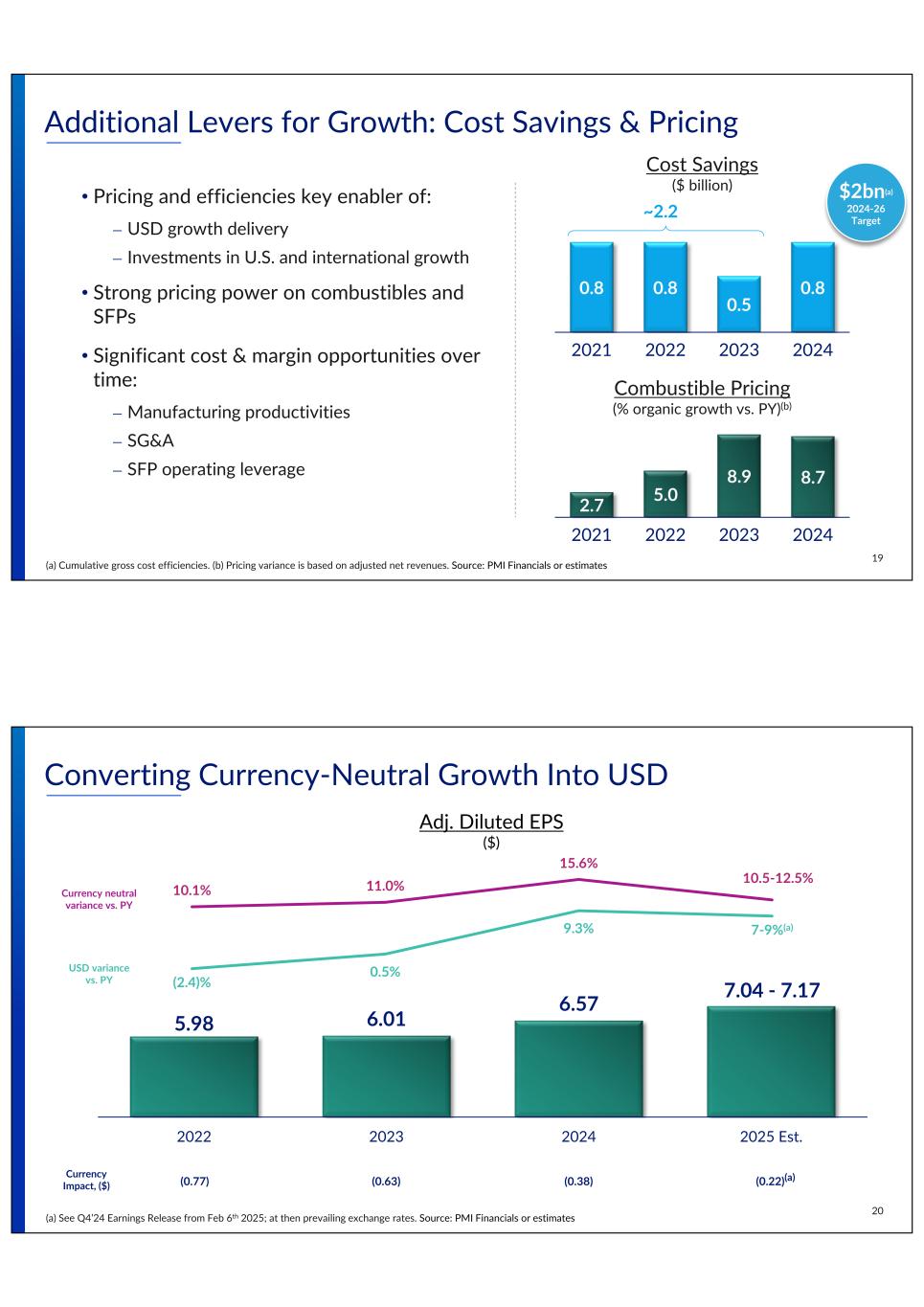 (a) Cumulative gross cost efficiencies. (b) Pricing variance is based on adjusted net revenues. Source: PMI Financials or estimates Additional Levers for Growth: Cost Savings & Pricing 19 • Pricing and efficiencies key enabler of:⎼ USD growth delivery⎼ Investments in U.S. and international growth • Strong pricing power on combustibles and SFPs • Significant cost & margin opportunities over time:⎼ Manufacturing productivities⎼ SG&A ⎼ SFP operating leverage 2.7 5.0 8.9 8.7 2021 2022 2023 2024 Combustible Pricing (% organic growth vs. PY)(b) 0.8 0.8 0.5 0.8 2021 2022 2023 2024 Cost Savings ($ billion) $2bn(a) 2024-26 Target~2.2 10.1% 11.0% 15.6% (2.4)% 0.5% 9.3% (a) See Q4’24 Earnings Release from Feb 6th 2025; at then prevailing exchange rates. Source: PMI Financials or estimates Converting Currency-Neutral Growth Into USD 20 Adj. Diluted EPS ($) 5.98 6.01 6.57 2022 2023 2024 2025 Est. Currency neutral variance vs. PY Currency Impact, ($) (0.77) (0.63) (0.38) 7.04 - 7.17 (0.22)(a) 7-9%(a) 10.5-12.5% USD variance vs. PY
