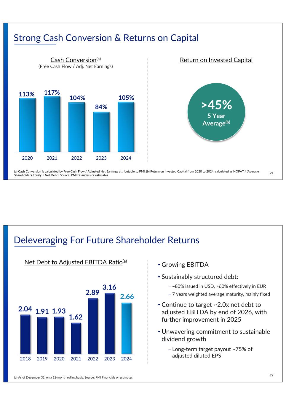 (a) Cash Conversion is calculated by Free Cash Flow / Adjusted Net Earnings attributable to PMI. (b) Return on Invested Capital from 2020 to 2024, calculated as NOPAT / (Average Shareholders Equity + Net Debt). Source: PMI Financials or estimates Strong Cash Conversion & Returns on Capital 21 Return on Invested Capital 113% 117% 104% 84% 105% 2020 2021 2022 2023 2024 Cash Conversion(a) (Free Cash Flow / Adj. Net Earnings) >45% 5 Year Average(b) (a) As of December 31, on a 12-month rolling basis. Source: PMI Financials or estimates Deleveraging For Future Shareholder Returns 22 2.04 1.91 1.93 1.62 2.89 3.16 2.66 2018 2019 2020 2021 2022 2023 2024 • Growing EBITDA • Sustainably structured debt:⎼ ~80% issued in USD, >60% effectively in EUR⎼ 7 years weighted average maturity, mainly fixed • Continue to target ~2.0x net debt to adjusted EBITDA by end of 2026, with further improvement in 2025 • Unwavering commitment to sustainable dividend growth⎼ Long-term target payout ~75% of adjusted diluted EPS Net Debt to Adjusted EBITDA Ratio(a)