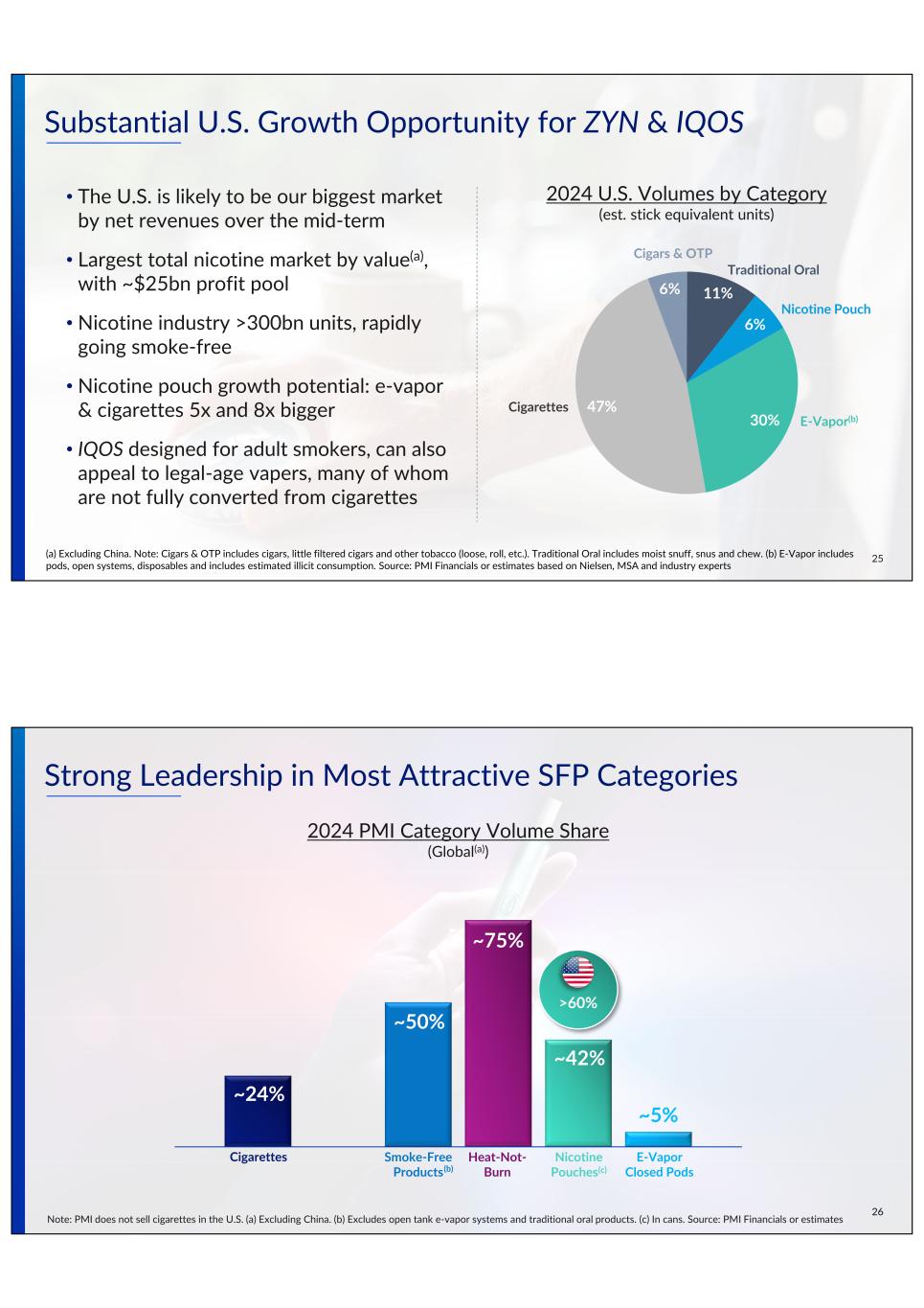 • 10 Years of Smoke-Free • Delivering Superior Returns to Shareholders • Strong Brands Led By Consumer Insights & Harm Reduction Substantial Int’l Growth Opportunity for IQOS, ZYN & VEEV 24 86% 7% ~6% 1% E-Vapor(a) Oral SFP HTUs 2024 International Volumes by Category (est. stick equivalent units) • Total nicotine market close to stable, continued migration to smoke-free products • Changing consumer preferences generate incremental growth opportunities:⎼ IQOS & ZYN well-positioned for SFP poly- use in the U.S. and internationally⎼ Multicategory approach to innovation and commercialization (a) Includes estimated size of open tank systems and illicit e-vapor. Note: Excludes China and U.S. Excludes other tobacco products (OTP). Source: PMI Financials or estimates, Various data sources Cigarettes