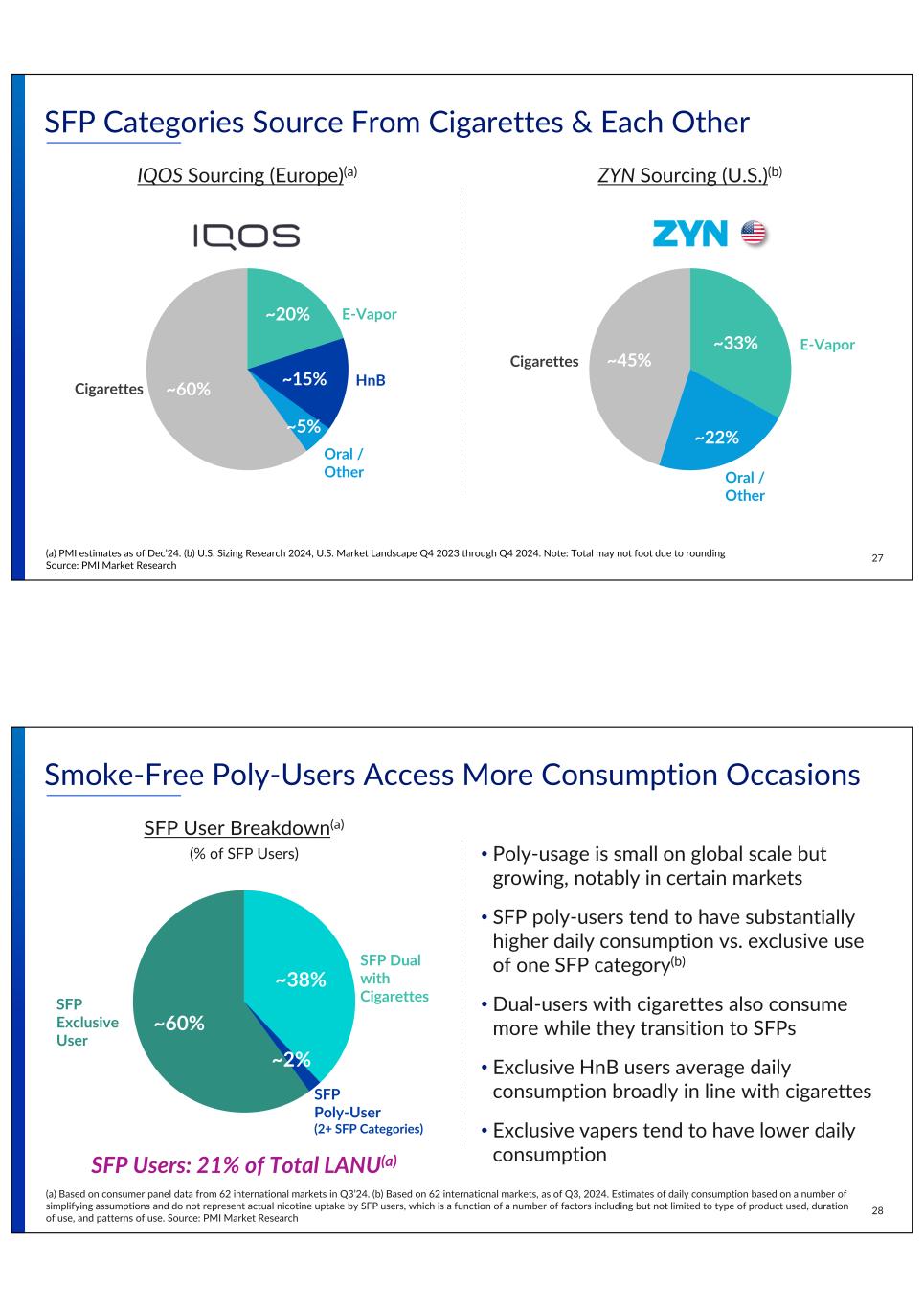 SFP Categories Source From Cigarettes & Each Other 27 IQOS Sourcing (Europe)(a) ZYN Sourcing (U.S.)(b) ~60% ~20% ~15% ~5% ~45% ~33% ~22% Cigarettes E-Vapor HnB Oral / Other E-Vapor Cigarettes Oral / Other (a) PMI es mates as of Dec’24. (b) U.S. Sizing Research 2024, U.S. Market Landscape Q4 2023 through Q4 2024 . Note: Total may not foot due to rounding Source: PMI Market Research Smoke-Free Poly-Users Access More Consumption Occasions 28 SFP User Breakdown(a) (% of SFP Users) ~60% ~38% ~2% SFP Exclusive User SFP Dual with Cigarettes SFP Poly-User (2+ SFP Categories) (a) Based on consumer panel data from 62 international markets in Q3’24. (b) Based on 62 international markets, as of Q3, 2024. Estimates of daily consumption based on a number of simplifying assumptions and do not represent actual nicotine uptake by SFP users, which is a function of a number of factors including but not limited to type of product used, duration of use, and patterns of use. Source: PMI Market Research SFP Users: 21% of Total LANU(a) • Poly-usage is small on global scale but growing, notably in certain markets • SFP poly-users tend to have substantially higher daily consumption vs. exclusive use of one SFP category(b) • Dual-users with cigarettes also consume more while they transition to SFPs • Exclusive HnB users average daily consumption broadly in line with cigarettes • Exclusive vapers tend to have lower daily consumption