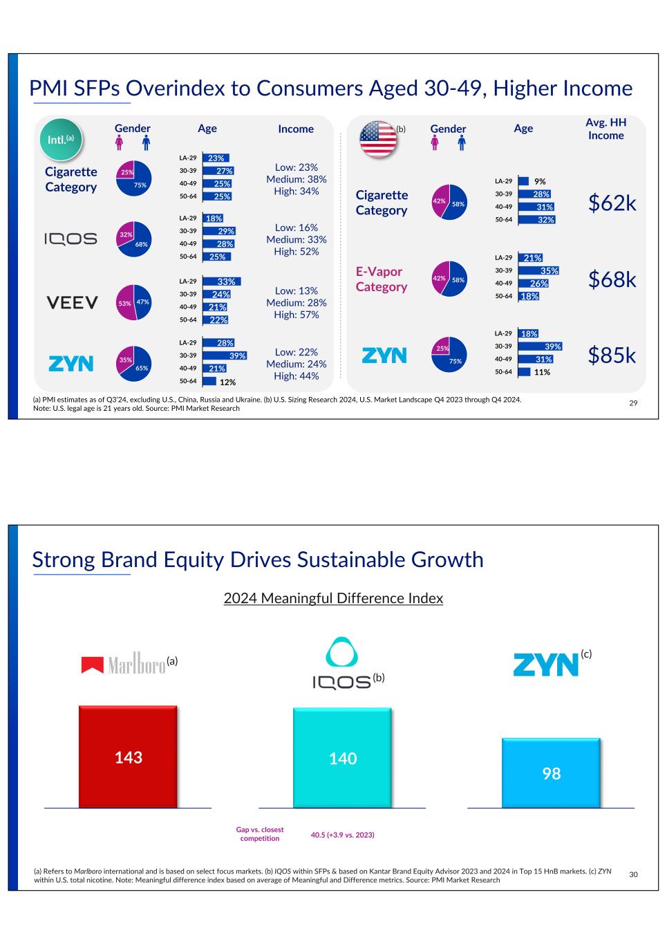 PMI SFPs Overindex to Consumers Aged 30-49, Higher Income 29 Cigarette Category E-Vapor Category Gender Age Avg. HH Income 58%42% 75% 25% 58%42% 32% 31% 28% 9% 50-64 40-49 30-39 LA-29 11% 31% 39% 18% 50-64 40-49 30-39 LA-29 18% 26% 35% 21% 50-64 40-49 30-39 LA-29 $62k $68k $85k Cigarette Category 75% 25% 68% 32% 47%53% 25% 25% 27% 23% 50-64 40-49 30-39 LA-29 25% 28% 29% 18% 50-64 40-49 30-39 LA-29 22% 21% 24% 33% 50-64 40-49 30-39 LA-29 Low: 23% Medium: 38% High: 34% Low: 16% Medium: 33% High: 52% Gender Age Income Low: 13% Medium: 28% High: 57% 65% 35% 12% 21% 39% 28% 50-64 40-49 30-39 LA-29 Low: 22% Medium: 24% High: 44% Intl.(a) (b) (a) PMI estimates as of Q3’24, excluding U.S., China, Russia and Ukraine. (b) U.S. Sizing Research 2024, U.S. Market Landscape Q4 2023 through Q4 2024 . Note: U.S. legal age is 21 years old. Source: PMI Market Research Strong Brand Equity Drives Sustainable Growth 30(a) Refers to Marlboro international and is based on select focus markets. (b) IQOS within SFPs & based on Kantar Brand Equity Advisor 2023 and 2024 in Top 15 HnB markets. (c) ZYN within U.S. total nicotine. Note: Meaningful difference index based on average of Meaningful and Difference metrics. Source: PMI Market Research 2024 Meaningful Difference Index (a) (b) (c) 40.5 (+3.9 vs. 2023) Gap vs. closest competition 143 140 98