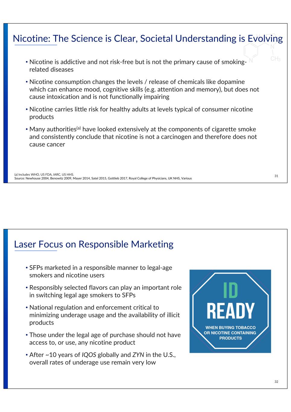 Nicotine: The Science is Clear, Societal Understanding is Evolving 31(a) Includes WHO, US FDA, IARC, US HHS . Source: Newhouse 2004, Benowitz 2009, Mayer 2014, Satel 2015, Gottlieb 2017, Royal College of Physicians, UK NHS, Various • Nicotine is addictive and not risk-free but is not the primary cause of smoking- related diseases • Nicotine consumption changes the levels / release of chemicals like dopamine which can enhance mood, cognitive skills (e.g. attention and memory), but does not cause intoxication and is not functionally impairing • Nicotine carries little risk for healthy adults at levels typical of consumer nicotine products •Many authorities(a) have looked extensively at the components of cigarette smoke and consistently conclude that nicotine is not a carcinogen and therefore does not cause cancer • SFPs marketed in a responsible manner to legal-age smokers and nicotine users • Responsibly selected flavors can play an important role in switching legal age smokers to SFPs • National regulation and enforcement critical to minimizing underage usage and the availability of illicit products • Those under the legal age of purchase should not have access to, or use, any nicotine product • After ~10 years of IQOS globally and ZYN in the U.S., overall rates of underage use remain very low 32 Laser Focus on Responsible Marketing