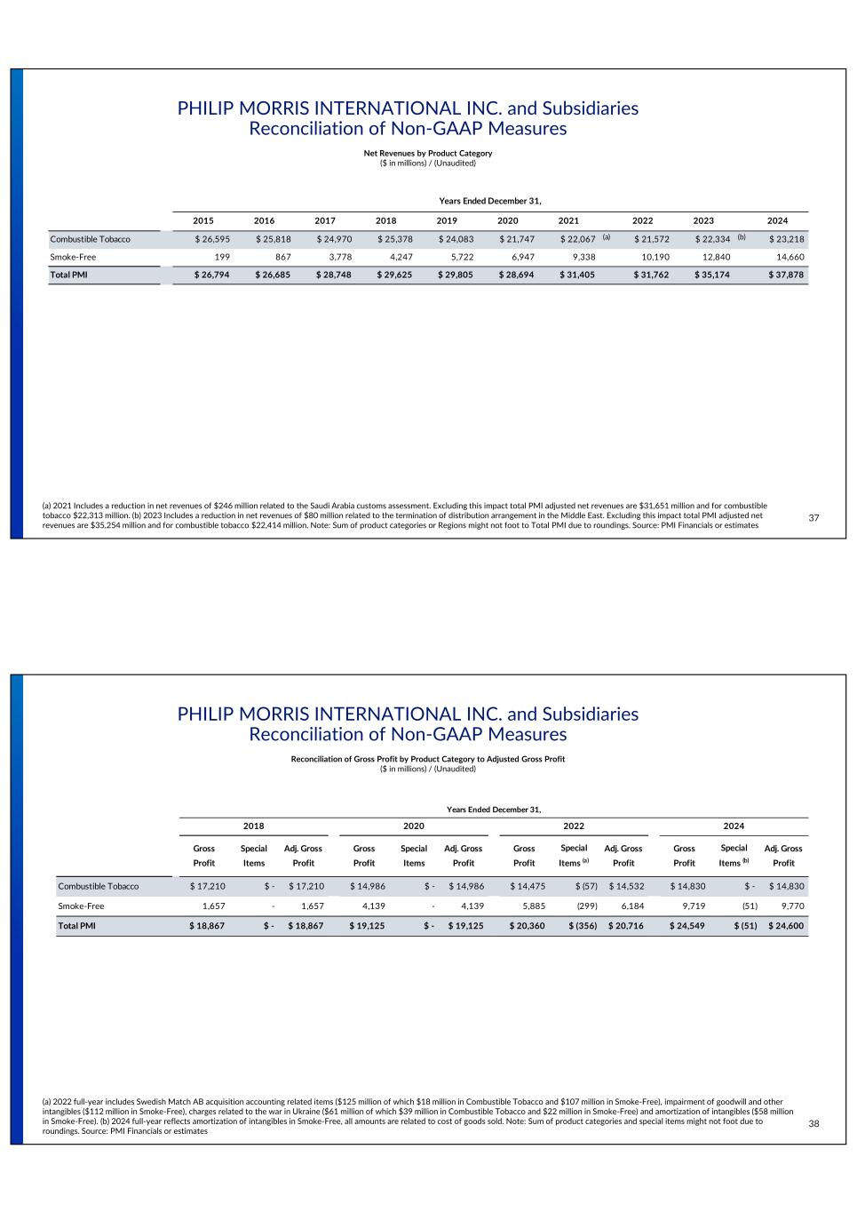 37 PHILIP MORRIS INTERNATIONAL INC. and Subsidiaries Reconciliation of Non-GAAP Measures Net Revenues by Product Category ($ in millions) / (Unaudited) (a) 2021 Includes a reduction in net revenues of $246 million related to the Saudi Arabia customs assessment. Excluding this impact total PMI adjusted net revenues are $31,651 million and for combustible tobacco $22,313 million. (b) 2023 Includes a reduction in net revenues of $80 million related to the termination of distribution arrangement in the Middle East. Excluding this impact total PMI adjusted net revenues are $35,254 million and for combustible tobacco $22,414 million. Note: Sum of product categories or Regions might not foot to Total PMI due to roundings. Source: PMI Financials or estimates 2015 2016 2017 2018 2019 2020 2021 2022 2023 2024 Combustible Tobacco $ 26,595 $ 25,818 $ 24,970 $ 25,378 $ 24,083 $ 21,747 $ 22,067 (a) $ 21,572 $ 22,334 (b) $ 23,218 Smoke-Free 199 867 3,778 4,247 5,722 6,947 9,338 10,190 12,840 14,660 Total PMI $ 26,794 $ 26,685 $ 28,748 $ 29,625 $ 29,805 $ 28,694 $ 31,405 $ 31,762 $ 35,174 $ 37,878 Years Ended December 31, 38 PHILIP MORRIS INTERNATIONAL INC. and Subsidiaries Reconciliation of Non-GAAP Measures Reconciliation of Gross Profit by Product Category to Adjusted Gross Profit ($ in millions) / (Unaudited) (a) 2022 full-year includes Swedish Match AB acquisition accounting related items ($125 million of which $18 million in Combustible Tobacco and $107 million in Smoke-Free), impairment of goodwill and other intangibles ($112 million in Smoke-Free), charges related to the war in Ukraine ($61 million of which $39 million in Combustible Tobacco and $22 million in Smoke-Free) and amortization of intangibles ($58 million in Smoke-Free). (b) 2024 full-year reflects amortization of intangibles in Smoke-Free, all amounts are related to cost of goods sold. Note: Sum of product categories and special items might not foot due to roundings. Source: PMI Financials or estimates Gross Profit Special Items Adj. Gross Profit Gross Profit Special Items Adj. Gross Profit Gross Profit Special Items (a) Adj. Gross Profit Gross Profit Special Items (b) Adj. Gross Profit Combustible Tobacco $ 17,210 $ - $ 17,210 $ 14,986 $ - $ 14,986 $ 14,475 $ (57) $ 14,532 $ 14,830 $ - $ 14,830 Smoke-Free 1,657 - 1,657 4,139 - 4,139 5,885 (299) 6,184 9,719 (51) 9,770 Total PMI $ 18,867 $ - $ 18,867 $ 19,125 $ - $ 19,125 $ 20,360 $ (356) $ 20,716 $ 24,549 $ (51) $ 24,600 Years Ended December 31, 2018 2020 2022 2024