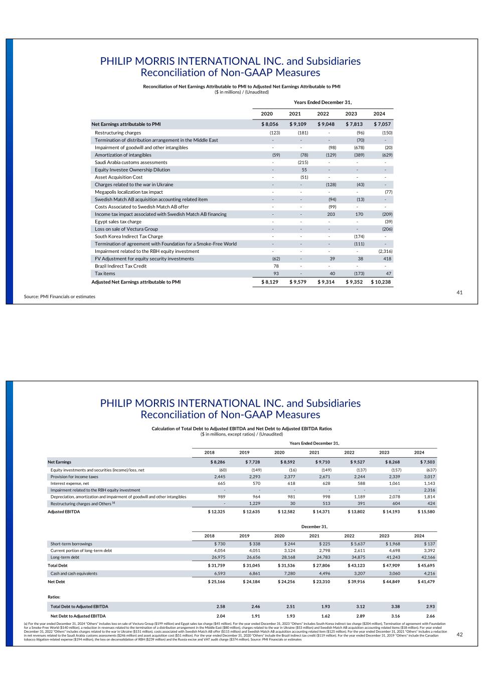 41 PHILIP MORRIS INTERNATIONAL INC. and Subsidiaries Reconciliation of Non-GAAP Measures Reconciliation of Net Earnings Attributable to PMI to Adjusted Net Earnings Attributable to PMI ($ in millions) / (Unaudited) Source: PMI Financials or estimates 2020 2021 2022 2023 2024 Net Earnings attributable to PMI $ 8,056 $ 9,109 $ 9,048 $ 7,813 $ 7,057 Restructuring charges (123) (181) - (96) (150) Termination of distribution arrangement in the Middle East - - - (70) - Impairment of goodwill and other intangibles - - (98) (678) (20) Amortization of intangibles (59) (78) (129) (389) (629) Saudi Arabia customs assessments - (215) - - - Equity Investee Ownership Dilution - 55 - - - Asset Acquisition Cost - (51) - - - Charges related to the war in Ukraine - - (128) (43) - Megapolis localization tax impact - - - - (77) Swedish Match AB acquisition accounting related item - - (94) (13) - Costs Associated to Swedish Match AB offer - - (99) - - Income tax impact associated with Swedish Match AB financing - - 203 170 (209) Egypt sales tax charge - - - - (39) Loss on sale of Vectura Group - - - - (206) South Korea Indirect Tax Charge - - - (174) - Termination of agreement with Foundation for a Smoke-Free World - - - (111) - Impairment related to the RBH equity investment - - - - (2,316) FV Adjustment for equity security investments (62) - 39 38 418 Brazil Indirect Tax Credit 78 - - - - Tax items 93 - 40 (173) 47 Adjusted Net Earnings attributable to PMI $ 8,129 $ 9,579 $ 9,314 $ 9,352 $ 10,238 Years Ended December 31, 42 PHILIP MORRIS INTERNATIONAL INC. and Subsidiaries Reconciliation of Non-GAAP Measures Calculation of Total Debt to Adjusted EBITDA and Net Debt to Adjusted EBITDA Ratios ($ in millions, except ratios) / (Unaudited) 2018 2019 2020 2021 2022 2023 2024 Net Earnings $ 8,286 $ 7,728 $ 8,592 $ 9,710 $ 9,527 $ 8,268 $ 7,503 Equity investments and securities (income)/loss, net (60) (149) (16) (149) (137) (157) (637) Provision for income taxes 2,445 2,293 2,377 2,671 2,244 2,339 3,017 Interest expense, net 665 570 618 628 588 1,061 1,143 Impairment related to the RBH equity investment - - - - - - 2,316 Depreciation, amortization and impairment of goodwill and other intangibles 989 964 981 998 1,189 2,078 1,814 Restructuring charges and Others (a) - 1,229 30 513 391 604 424 Adjusted EBITDA $ 12,325 $ 12,635 $ 12,582 $ 14,371 $ 13,802 $ 14,193 $ 15,580 2018 2019 2020 2021 2022 2023 2024 Short-term borrowings $ 730 $ 338 $ 244 $ 225 $ 5,637 $ 1,968 $ 137 Current portion of long-term debt 4,054 4,051 3,124 2,798 2,611 4,698 3,392 Long-term debt 26,975 26,656 28,168 24,783 34,875 41,243 42,166 Total Debt $ 31,759 $ 31,045 $ 31,536 $ 27,806 $ 43,123 $ 47,909 $ 45,695 Cash and cash equivalents 6,593 6,861 7,280 4,496 3,207 3,060 4,216 Net Debt $ 25,166 $ 24,184 $ 24,256 $ 23,310 $ 39,916 $ 44,849 $ 41,479 Ratios: Total Debt to Adjusted EBITDA 2.58 2.46 2.51 1.93 3.12 3.38 2.93 Net Debt to Adjusted EBITDA 2.04 1.91 1.93 1.62 2.89 3.16 2.66 Years Ended December 31, December 31, (a) For the year ended December 31, 2024 "Others" includes loss on sale of Vectura Group ($199 million) and Egypt sales tax charge ($45 million). For the year ended December 31, 2023 "Others" includes South Korea indirect tax charge ($204 million), Termination of agreement with Foundation for a Smoke-Free World ($140 million), a reduction in revenues related to the termination of a distribution arrangement in the Middle East ($80 million), charges related to the war in Ukraine ($53 million) and Swedish Match AB acquisition accounting related items ($18 million). For year ended December 31, 2022 "Others" includes charges related to the war in Ukraine ($151 million), costs associated with Swedish Match AB offer ($115 million) and Swedish Match AB acquisition accounting related item ($125 million). For the year ended December 31, 2021 "Others" includes a reduction in net revenues related to the Saudi Arabia customs assessments ($246 million) and asset acquisition cost ($51 million). For the year ended December 31, 2020 "Others" include the Brazil indirect tax credit ($119 million). For the year ended December 31, 2019 "Others" include the Canadian tobacco litigation-related expense ($194 million), the loss on deconsolidation of RBH ($239 million) and the Russia excise and VAT audit charge ($374 million). Source: PMI Financials or estimates